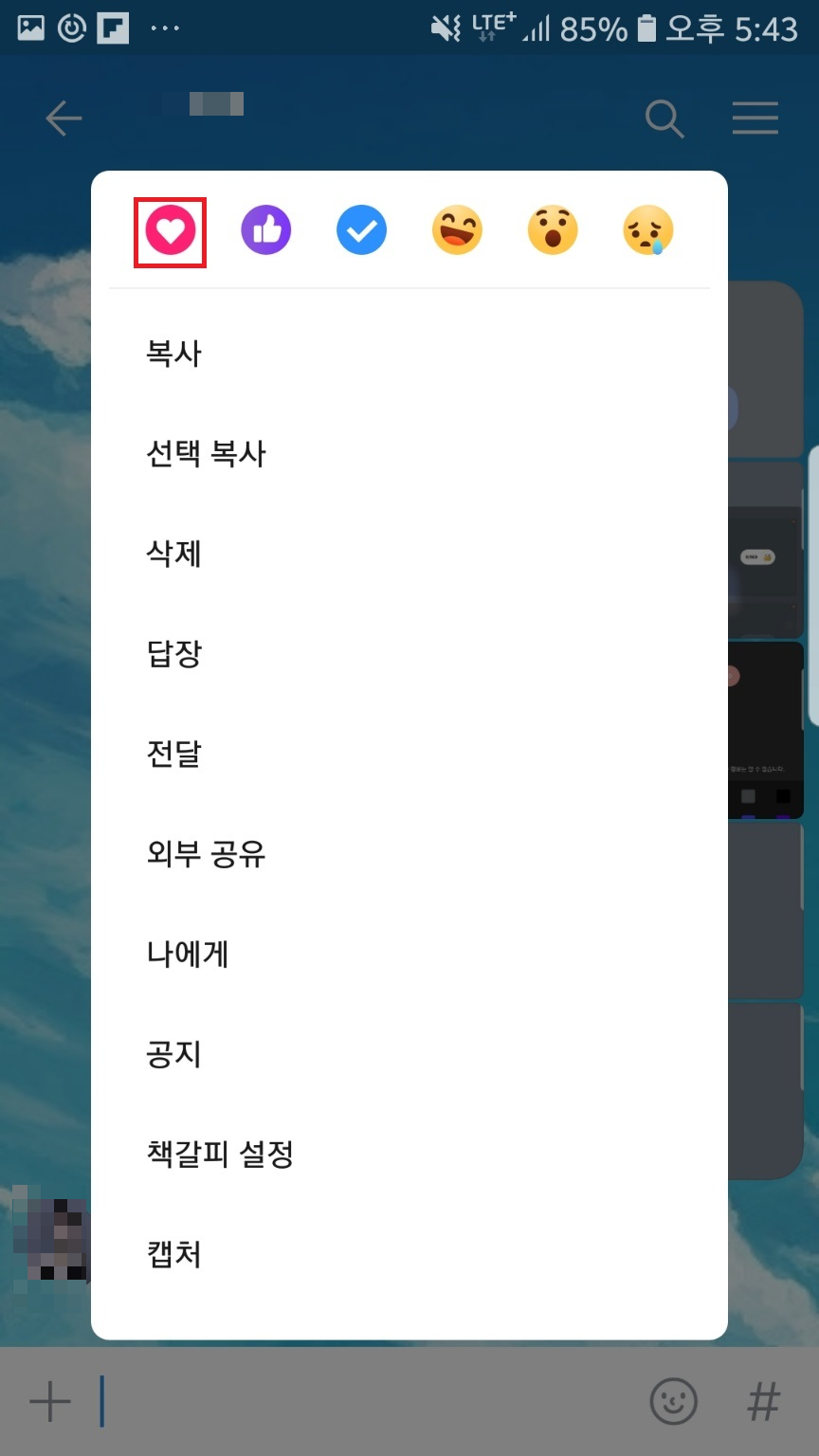 메세지를 길게 꾹 눌러주시고 상단 하트를 눌러주시면 공감 표시가 되는데요!