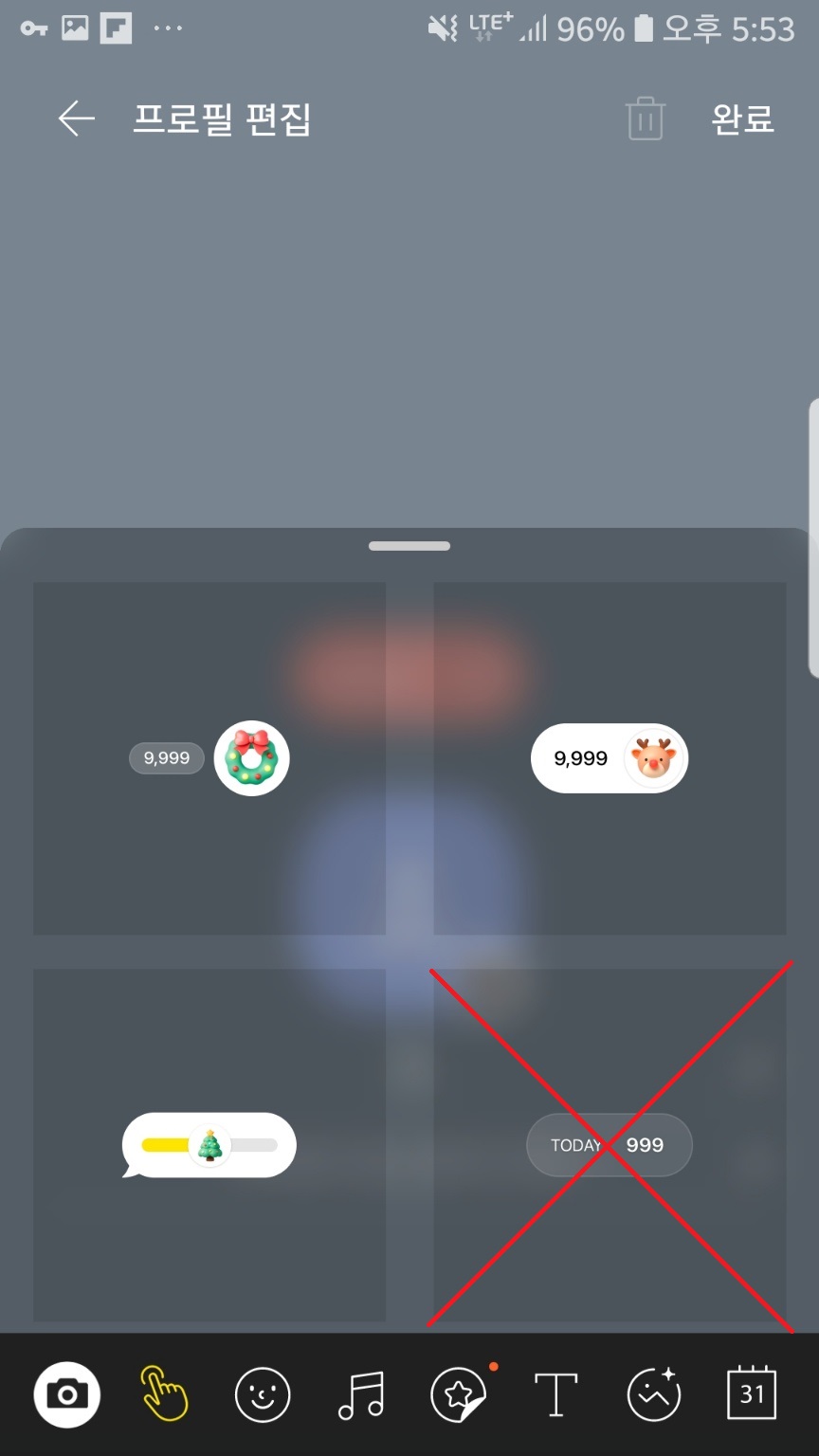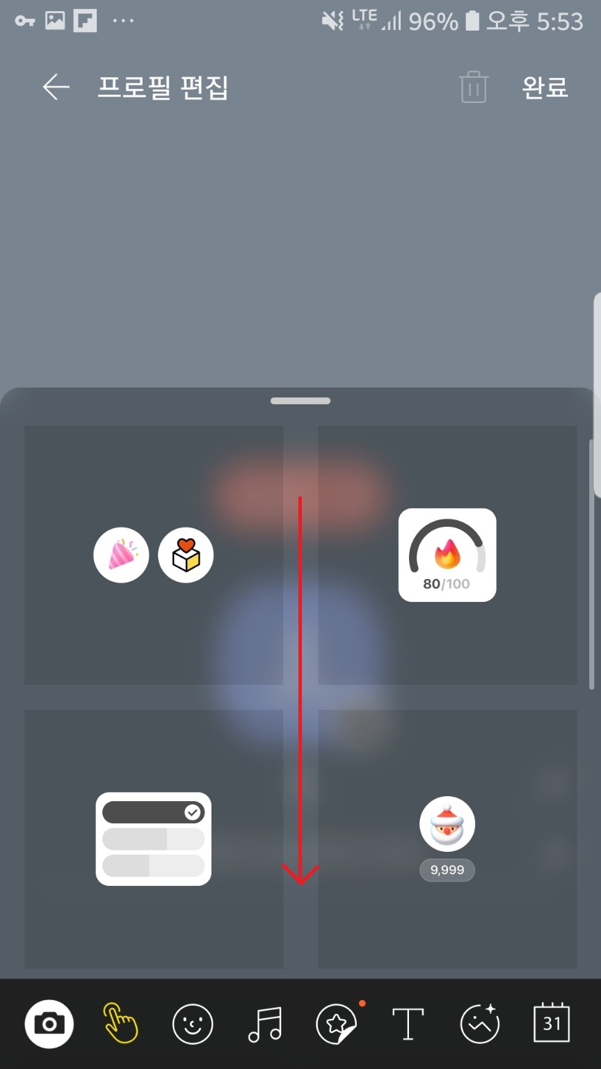 아래 위로 스크롤하여 목록 중에서 마음에 드는 공감스티커를 선택해주세요. 이때, 가운데에 X표시 되어 있는 'Today' 위젯은 빼고 골라주셔야해요.