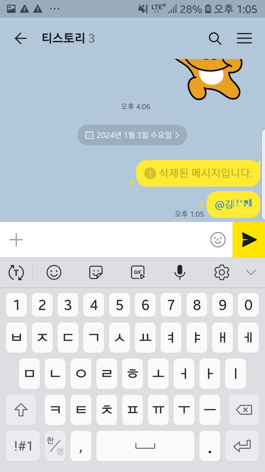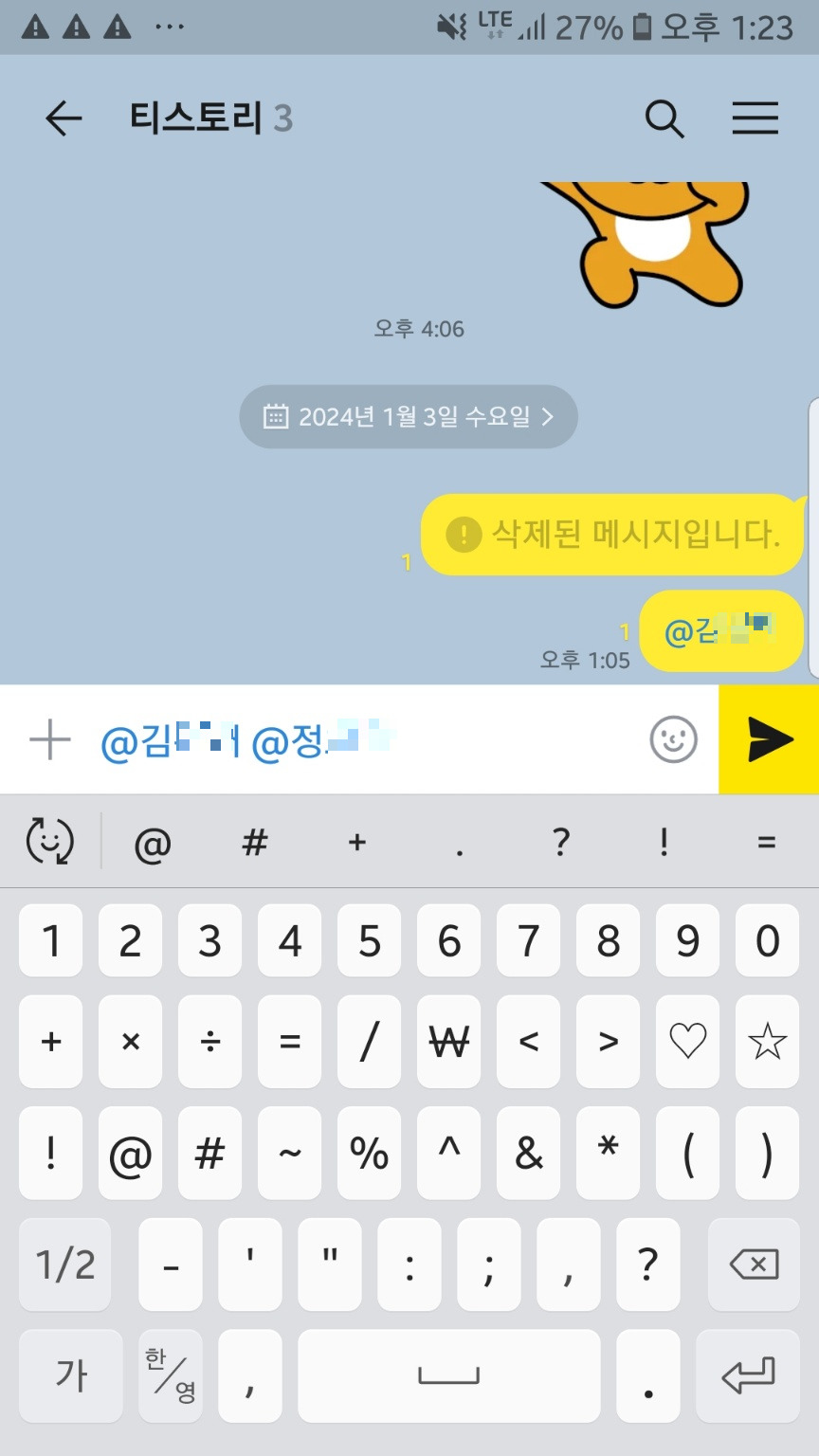 입력창 위에 뜨는 사람 중 멘션하고 싶은 사람을 선택하면 파란글씨로 이름이 입력되는데요. 이걸 보내주시면 된답니다.