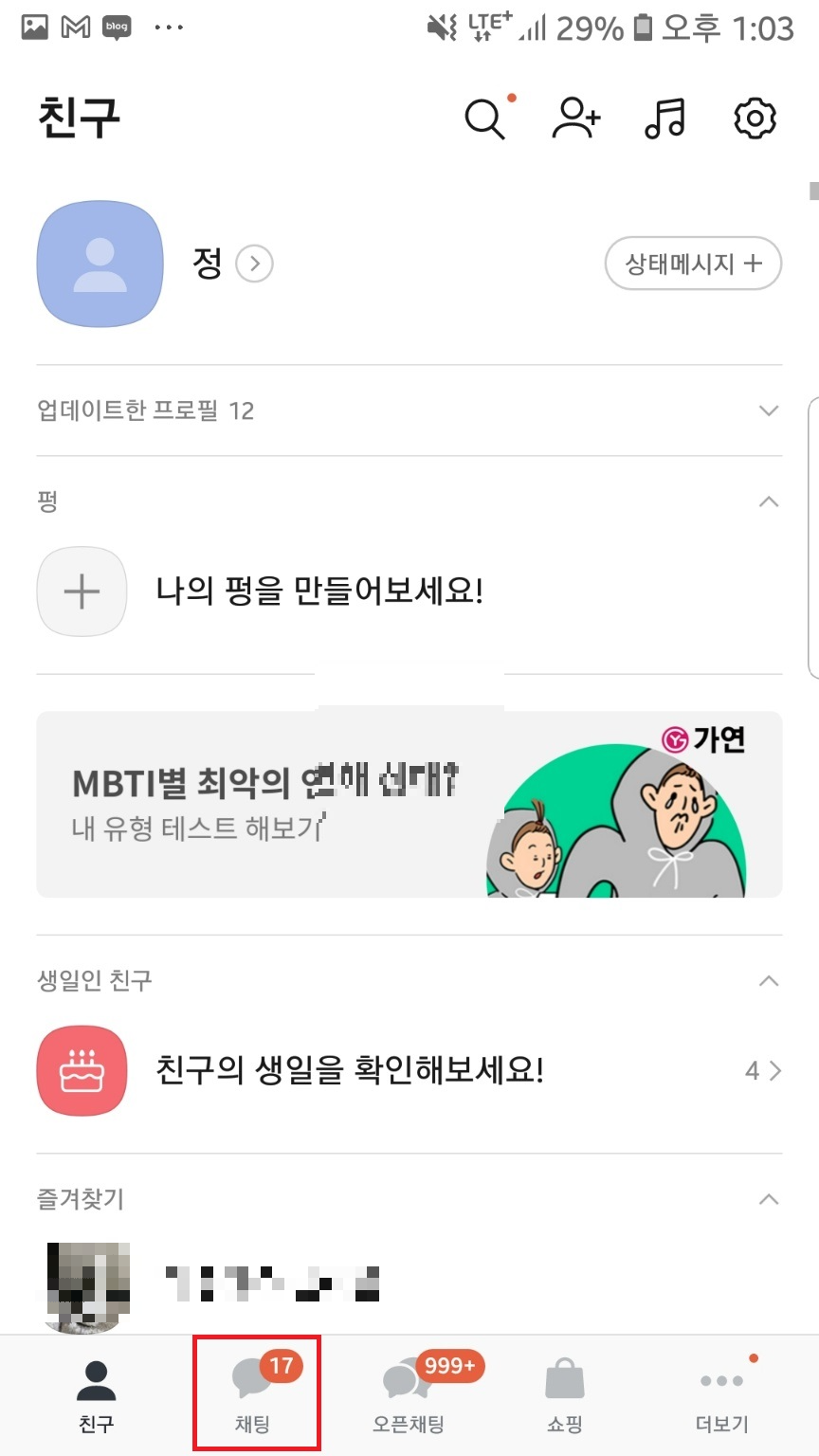 카톡을 실행해주시고 채팅 탭에 들어가주세요.