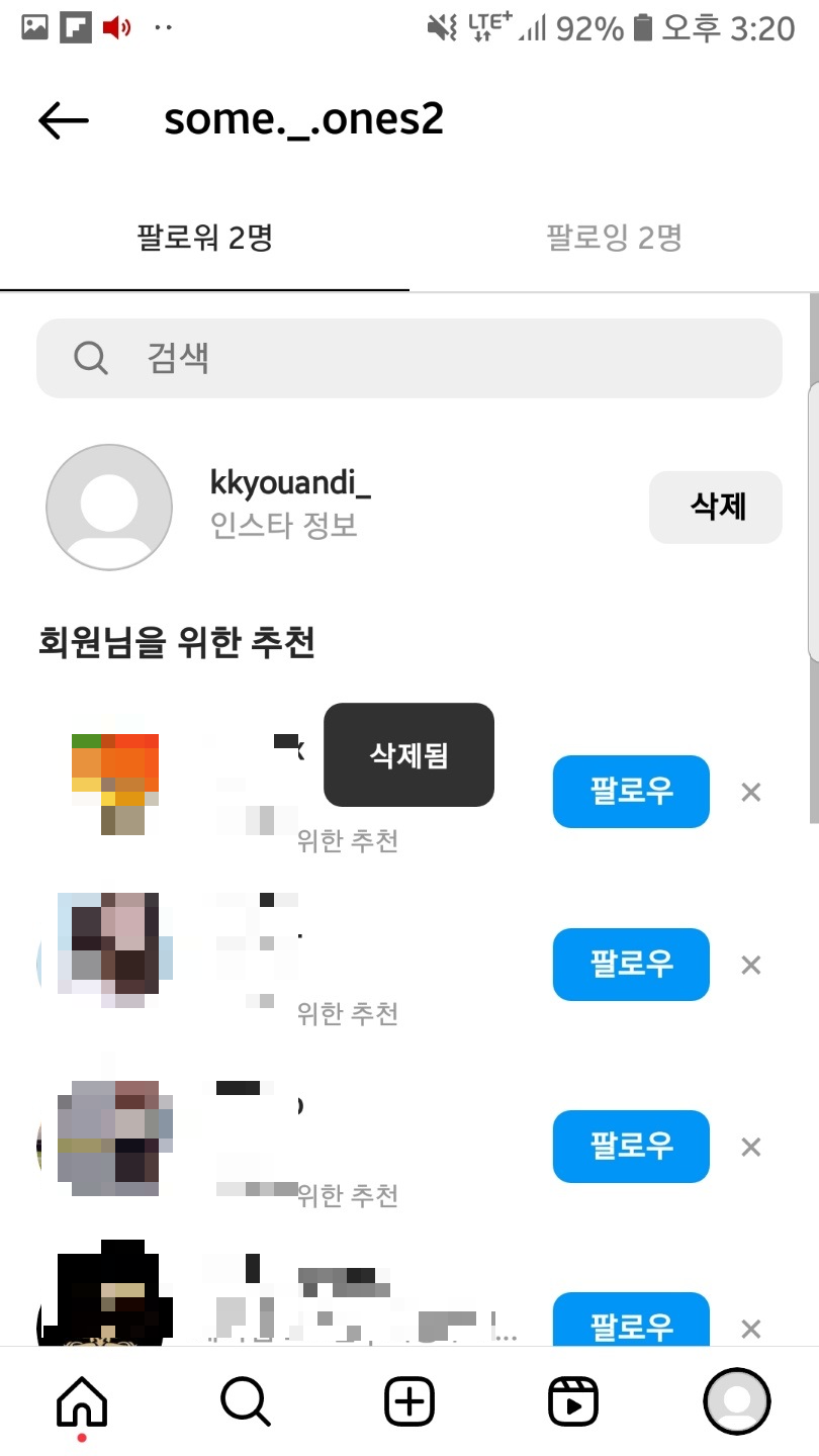 이상한 계정 팔로우가 오면 바로 간단하게 삭제할 수 있어 좋아요~