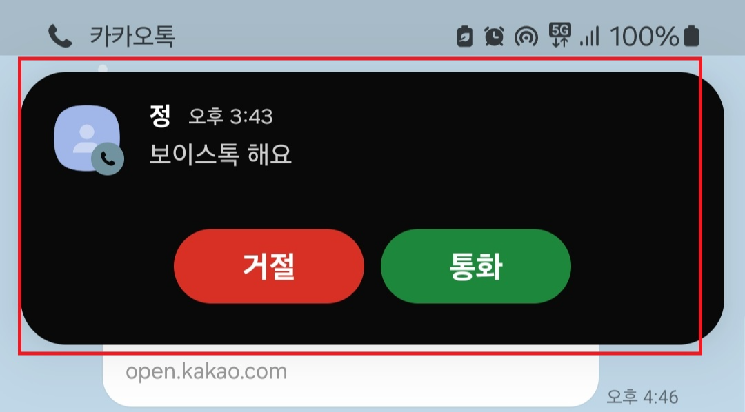 보이스톡을 걸면 채팅방 알림으로 뜨는 게 아니라 전화 오는 것처럼 벨소리까지 울린다는 점 참고해주세요!