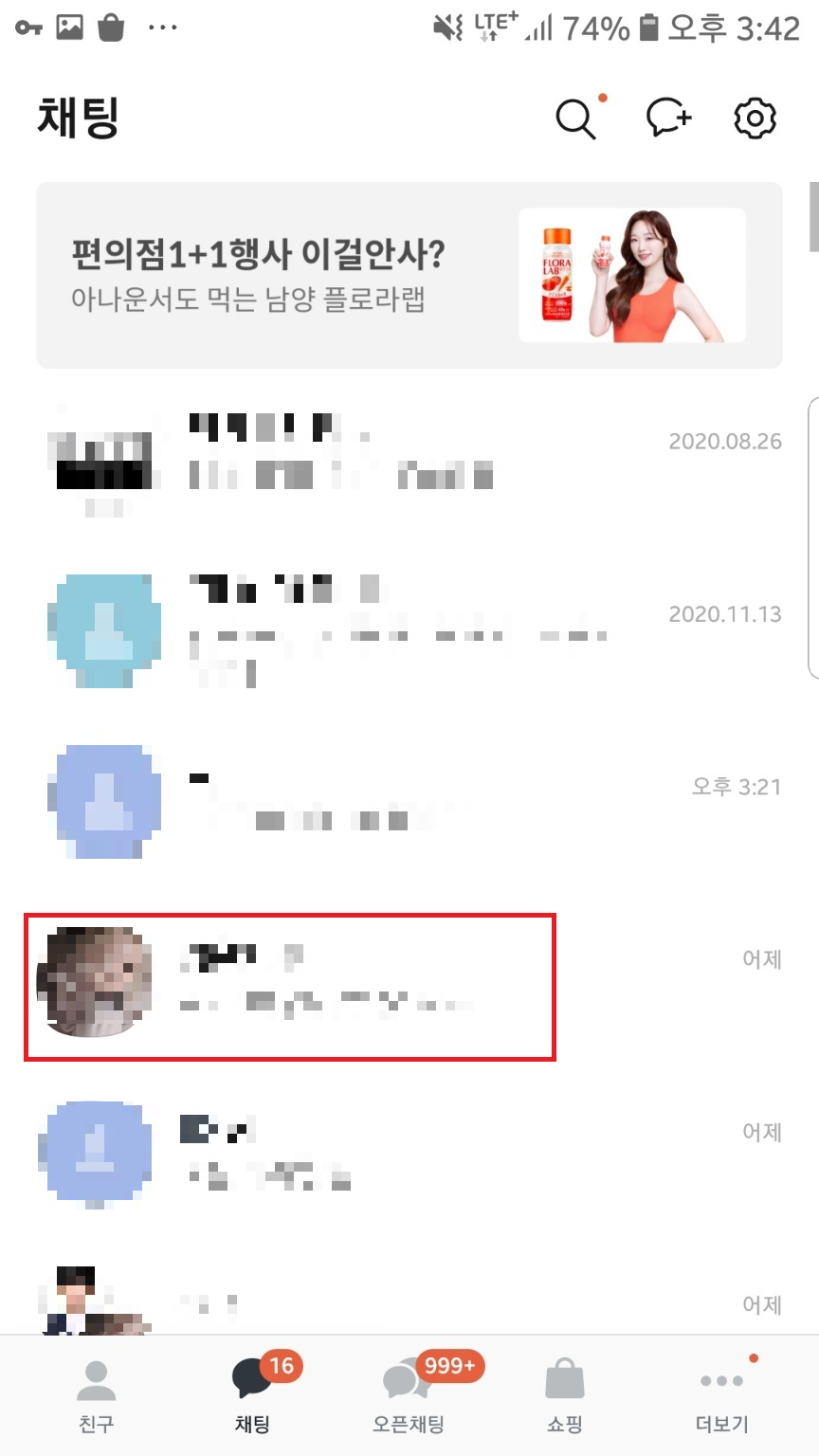 카톡 앱을 실행한 후 채팅 탭에 들어가주세요.
