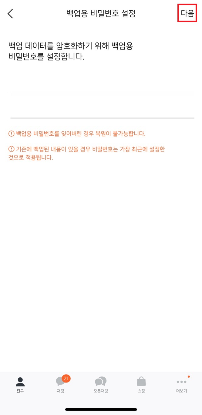 백업용 비밀번호 설정 4~16자리를 설정해 주신 후에 다음 버튼을 눌러주세요.