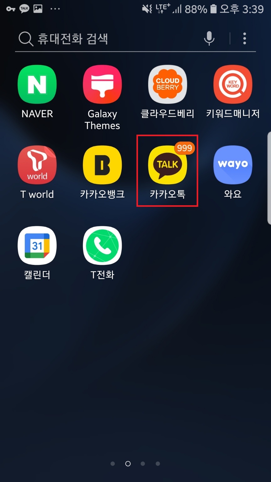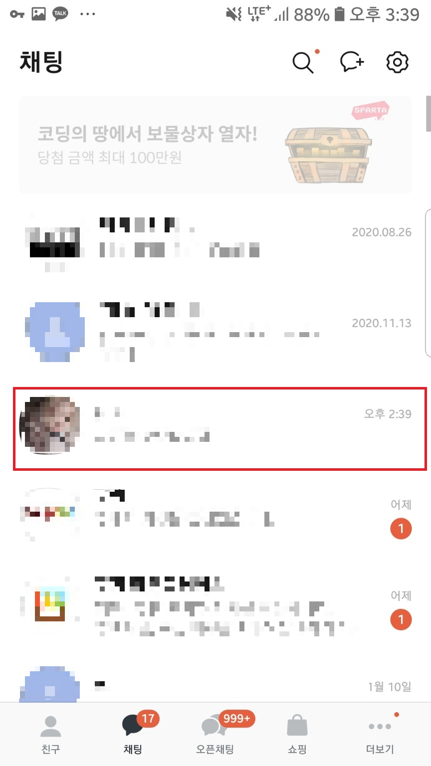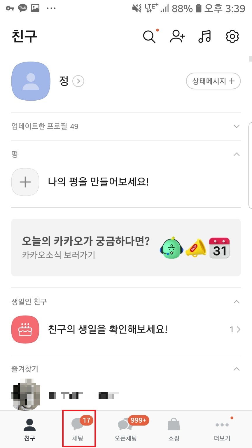 카톡을 실행한 후 채팅 탭으로 들어가주세요.