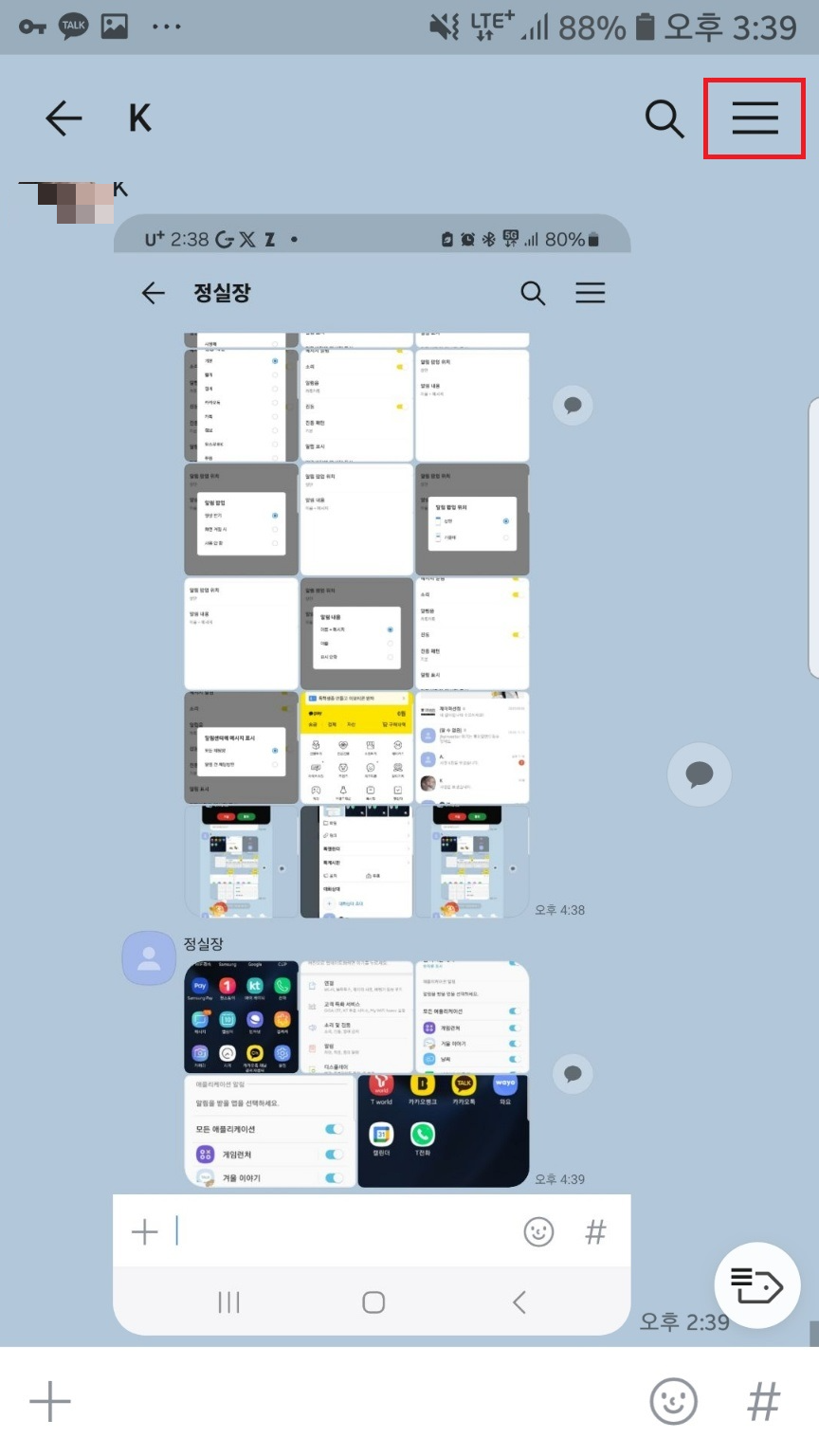 채팅방을 선택해 들어가주시고 우측 상단 선 세개를 클릭해 채팅방 서랍을 열어주세요.
