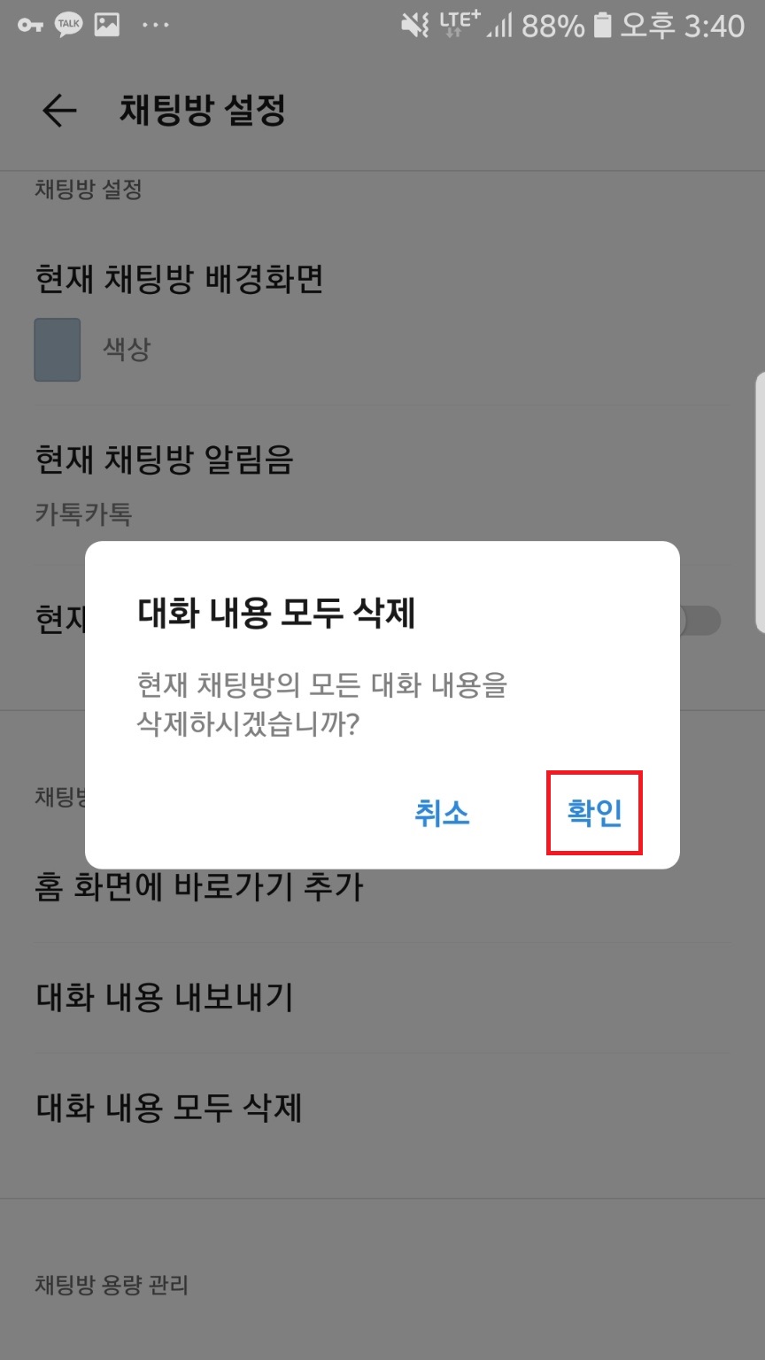 대화 내용 모두 삭제를 클릭한 후 확인을 눌러주세요.