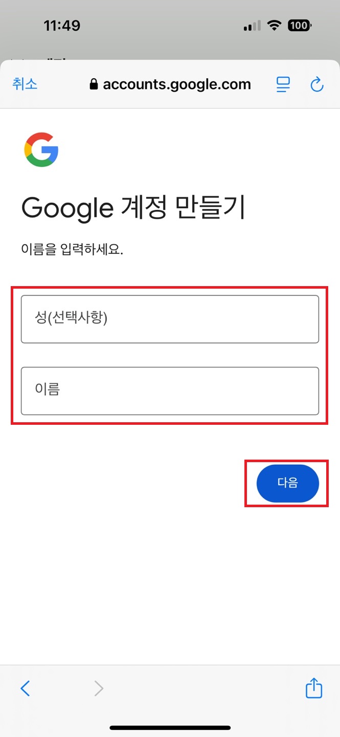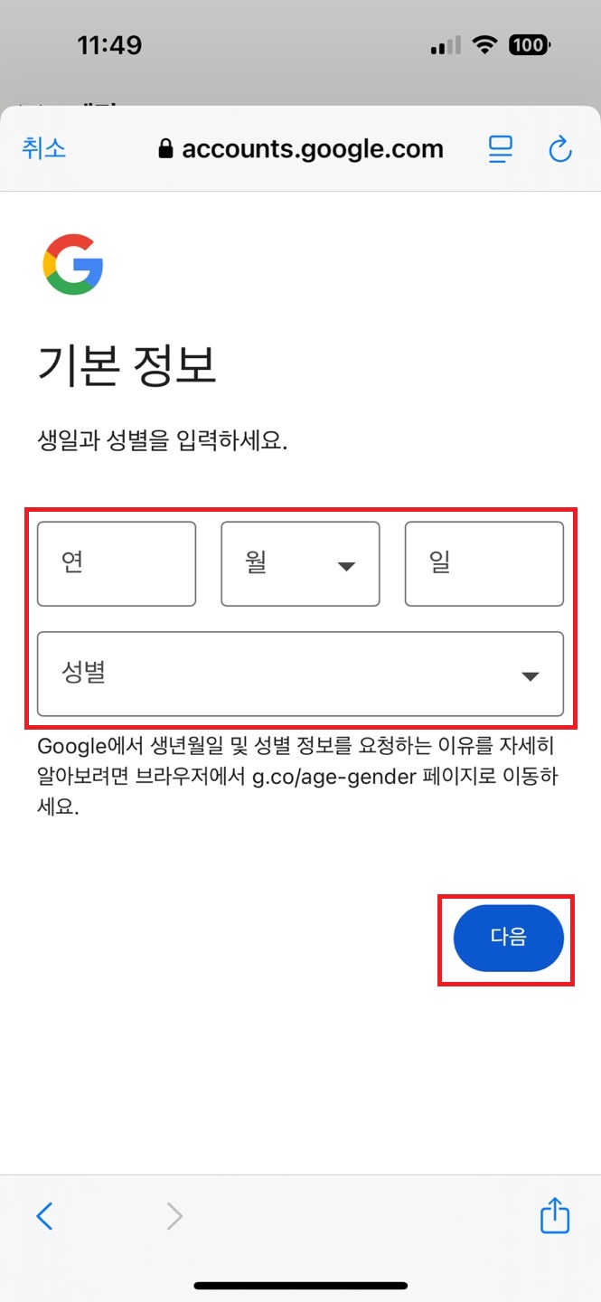 이름을 입력해주시고 다음을 눌러주세요. 그 다음 생년월일과 성별을 입력하고 다음을 한 번 더 클릭해주세요.