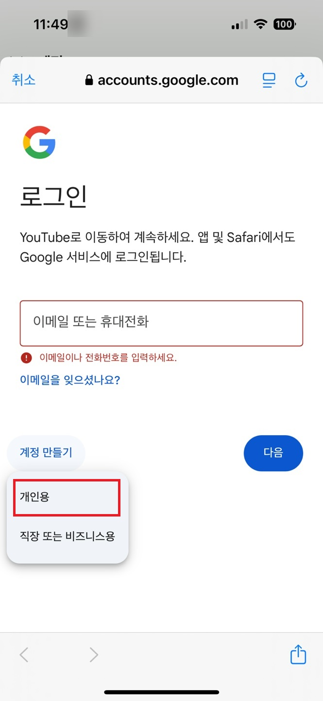 계정 만들기를 클릭해주시고 사용 용도에 따라 개인용/직장 또는 비즈니스용을 선택해주세요. 저는 개인용 채널이라 개인용을 선택했어요.