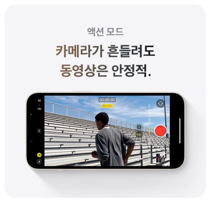 카메라에는 액션 모드 기능이 새롭게 생겨 카메라가 흔들려도 동영상을 안정적으로 촬영하실 수 있어요.