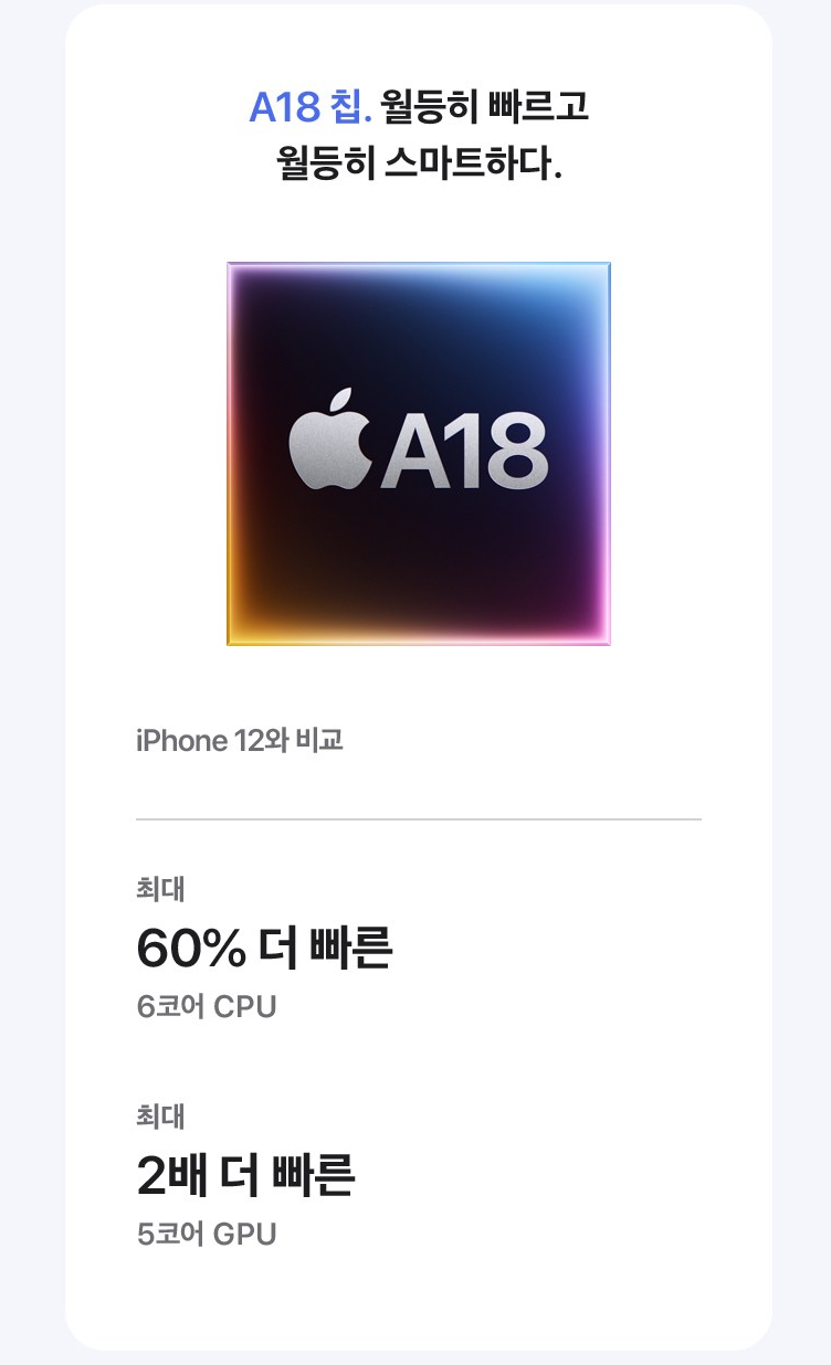 A18 칩이 탑재되어 아이폰 12와 비교하였을 때, 월등히 빠르고 월등히 스마트 해졌다는 점을 느끼실 수 있어요.