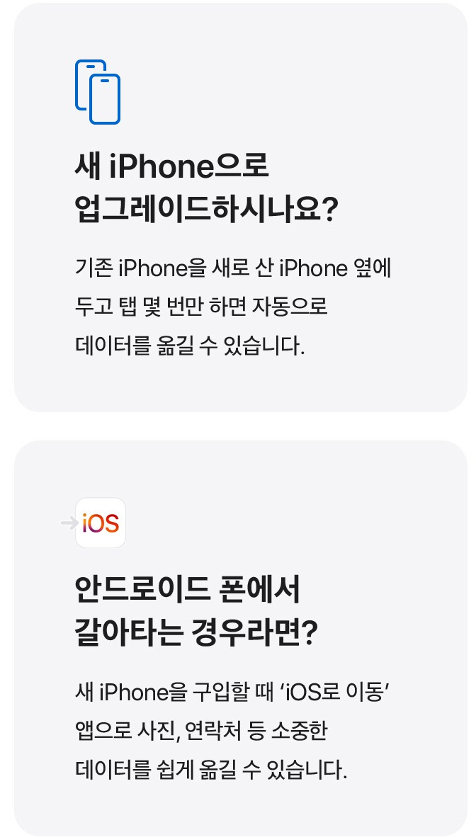 새 아이폰으로 업그레이드 하는 경우이거나, 안드로이드 폰에서 갈아타는 경우라면 간단하게 탭 몇 번만 하거나, 'iOS로 이동 기능'을 통해 손쉽게 데이터를 옮길 수 있어요.