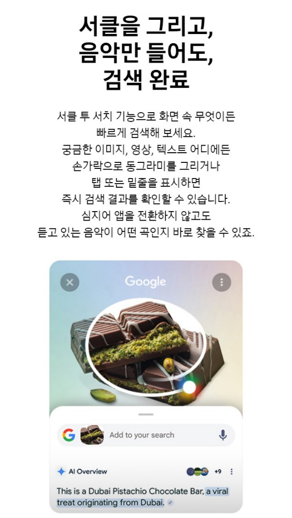 서클 투 서치 기능으로 화면 속 무엇이든 빠르게 검색해 보세요. 궁금한 이미지, 영상, 텍스트 어디에든 손가락으로 동그라미를 그리거나 탭 또는 밑줄을 표시하면 즉시 검색 결과를 확인할 수 있어요. 앱을 전환하지 않고도 듣고 있는 음악이 어떤 곡인지 바로 찾을 수 있어요.