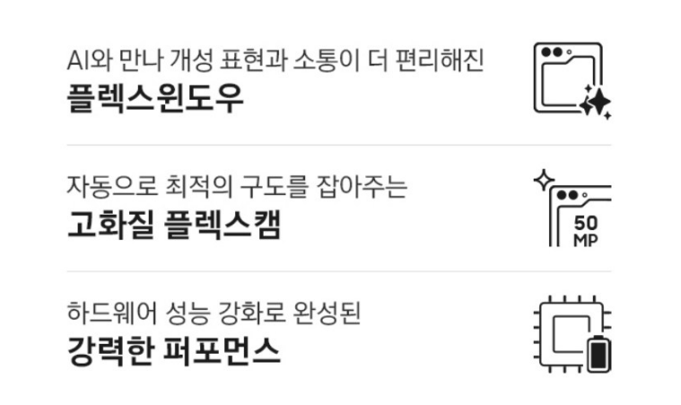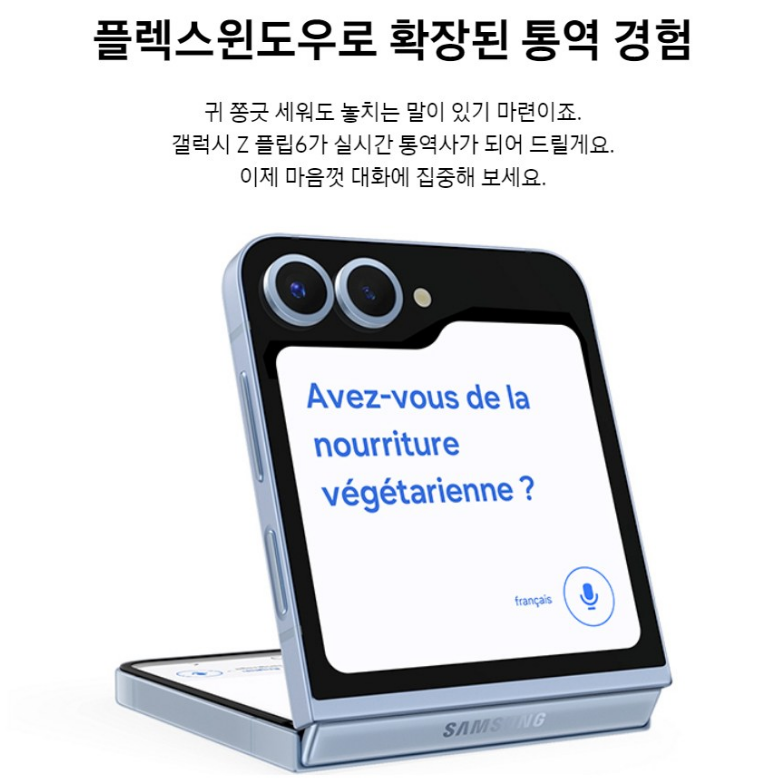 갤럭시 Z 플립6은 플렉스 윈도우, 고화질 플렉스캠, 강력한 퍼포먼스가 가장 큰 강점이에요.