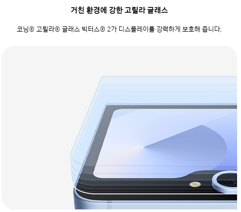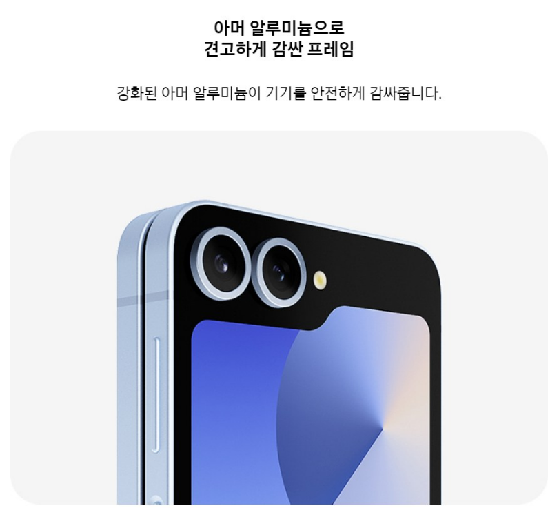 이번 Z 플립6 모델은 접히는 부분인 힌지 구조 개선에 힘을 쓴 모델이에요. 기존의 Z 플립 모델보다 주름 현상이 많이 완화되었으므로 Z 플립 모델을 꾸준히 사용하시던 분이라면 참고하시면 좋을 것 같아요.