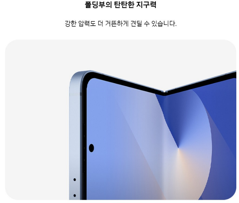 폴딩부의 탄탄한 지구력으로 강한 압력도 견딜 수 있어요. 또한 얇아져도 튼튼한 플렉스 힌지 덕분에 외부 충격에도 잘 견딜 수 있어요.
