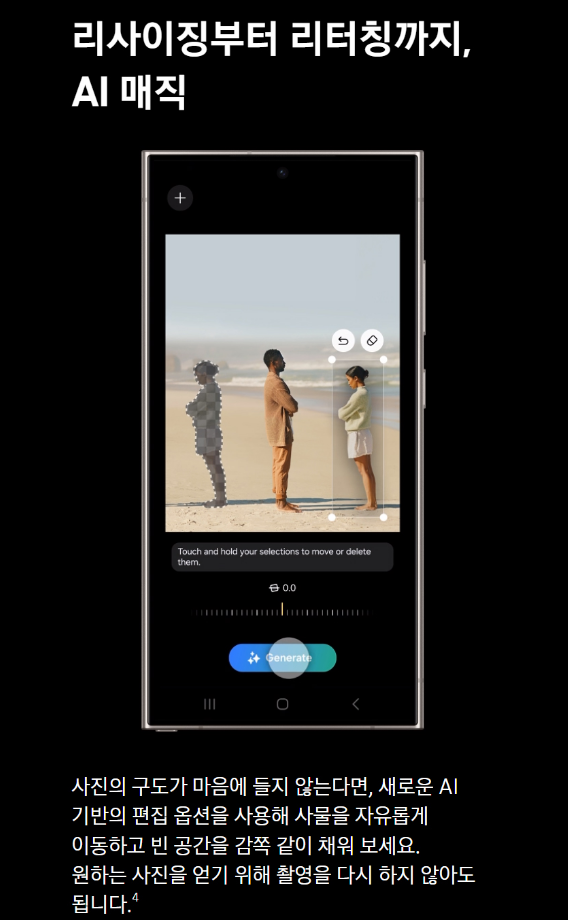 사진의 구도가 마음에 들지 않는다면 새로운 AI 기반의 편집 옵션을 사용해 사물을 자유롭게 이동하고 빈 공간을 감쪽 같이 채워보세요. 원하는 사진을 얻기 위해 다시 촬영을 하지 않아도 돼요.