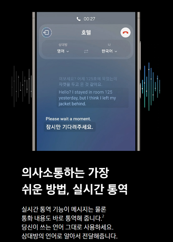실시간 통역 기능이 메세지는 물론 통화 내용도 바로 통역해줘요. 내가 쓰는 언어를 그대로 사용해도 상대방의 언어로 자동으로 번역하여 전달해줘요.