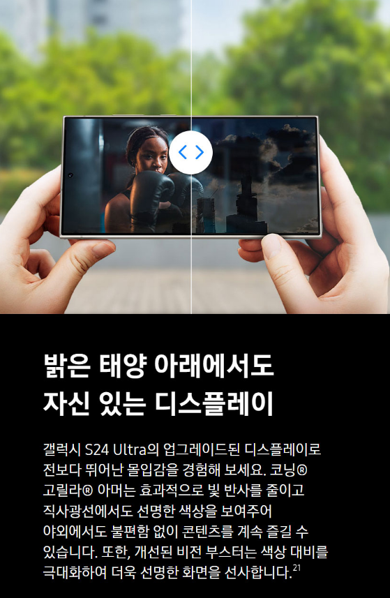 업그레이드된 디스플레이로 전보다 뛰어난 몰입감을 경험할 수 있어요. 코닝 고릴라 아머는 효과적으로 빛 반사를 줄이고 직사광선에도 선명한 색상을 보여주어 야외에서도 불편함 없이 콘텐츠를 계속 즐길 수 있어요. 또한 개선된 비전 부스터는 색상 대비를 극대화하여 더욱 선명한 화면을 선사해요.