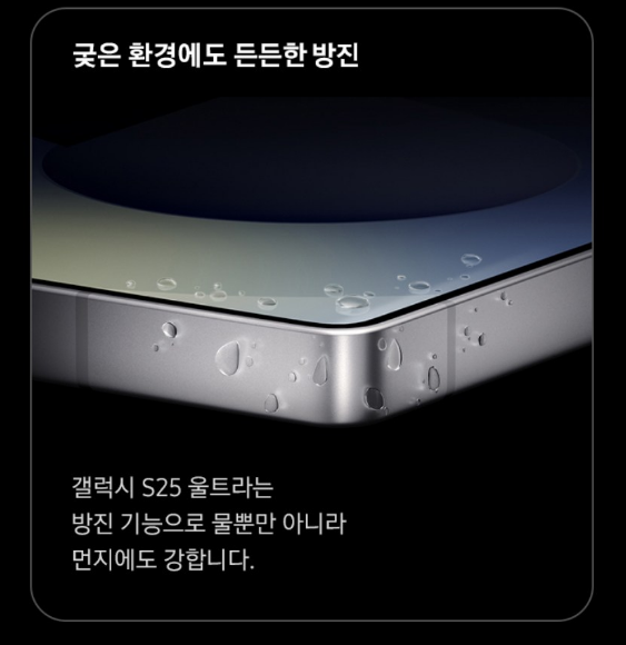 강인한 티타늄 프레임이 갤럭시 S25 울트라를 탄탄하게 감싸고 있어 언제 어디서나 안심할 수 있어요. 또한 탁월한 내구성을 자랑하는 코닝 고릴라 아머 2 글래스가 갤럭시를 안전하게 지켜주고 방진 기능으로 물뿐만 아니라 먼지에도 강해요.