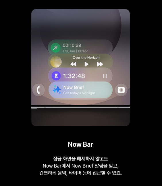잠금 화면을 해제하지 않고도 스마트 워치처럼 Now Bar에서 Now Brief 알림을 받고, 간편하게 음악, 타이머 등에 접근할 수 있어요.