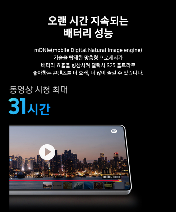 mDNIe 기술을 탑재한 맞춤형 프로세서가 배터리 효율을 향상시켜 갤럭시 S25 울트라로 좋아하는 콘텐츠를 더 오래, 더 많이 즐길 수 있어요.