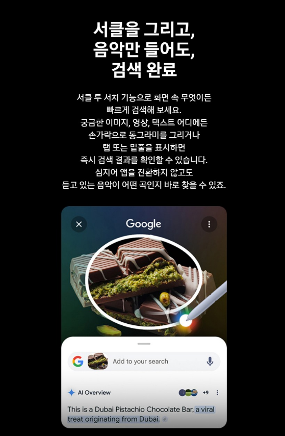서클 투 서치 기능으로 화면 속 무엇이든 빠르게 검색해 보세요. 궁금한 이미지, 영상, 텍스트 어디에든 손가락으로 동그라미를 그리거나 탭 또는 밑줄을 표시하면 즉시 검색 결과를 확인할 수 있습니다. 심지어 앱을 전환하지 않고도 듣고 있는 음악이 어떤 곡인지 바로 찾을 수 있어요.