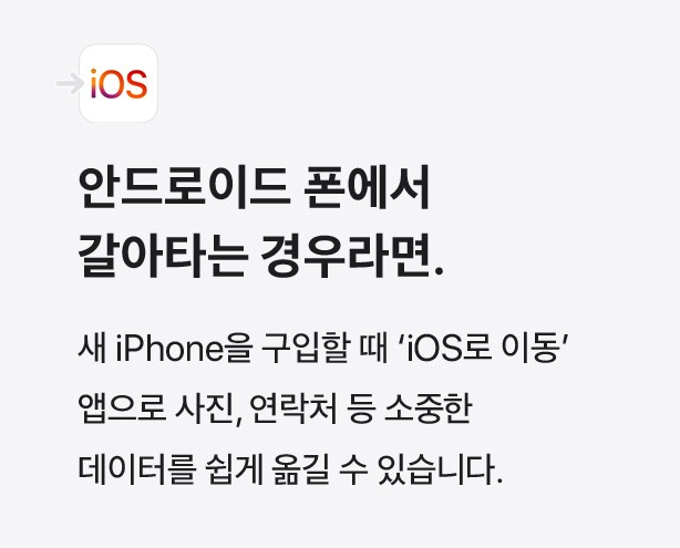 새 아이폰으로 업그레이드 하는 경우 기존 아이폰을 새로 산 아이폰 옆에 두고 탭 몇 번만 하면 자동으로 데이터를 옮길 수 있어요. 안드로이드 폰에서 갈아타는 경우라면 새 아이폰을 구입할 때 'iOS로 이동' 앱으로 사진, 연락처 등 소중한 데이터를 쉽게 옮길 수 있어요.