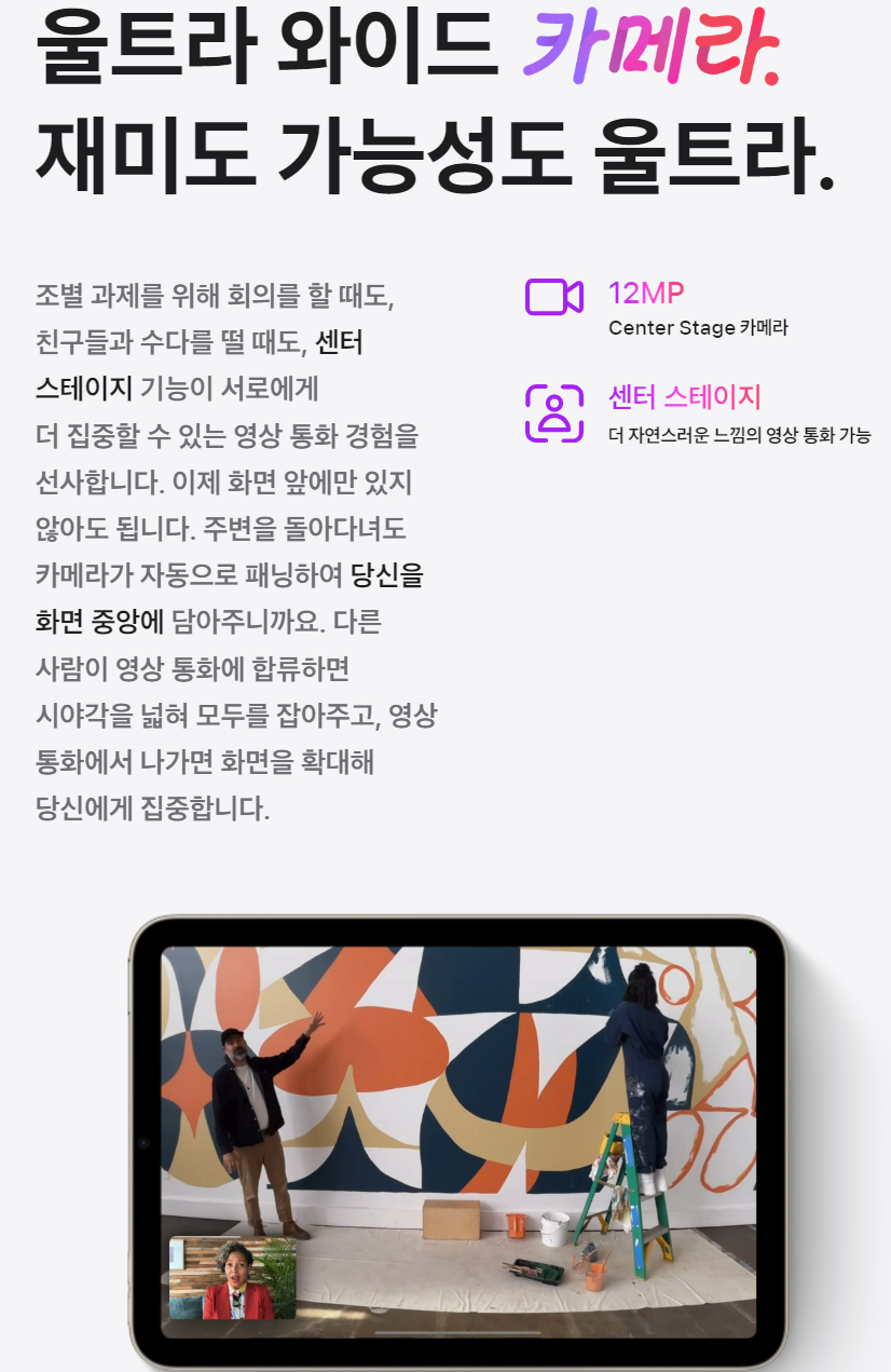 센터 스테이지 기능이 서로에게 더 집중할 수 있는 영상 통화 경험을 선사해요. 이제 화면 앞에 서있지 않아도, 주변을 돌아다녀도 카메라가 자동으로 패닝하여 화면 중앙에 나를 담아줘요. 다른 사람이 영상 통화에 합류하면 시야각을 넓혀 모두를 잡아주고 영상 통화에서 나가면 화면을 확대해 나에게 집중해줘요.