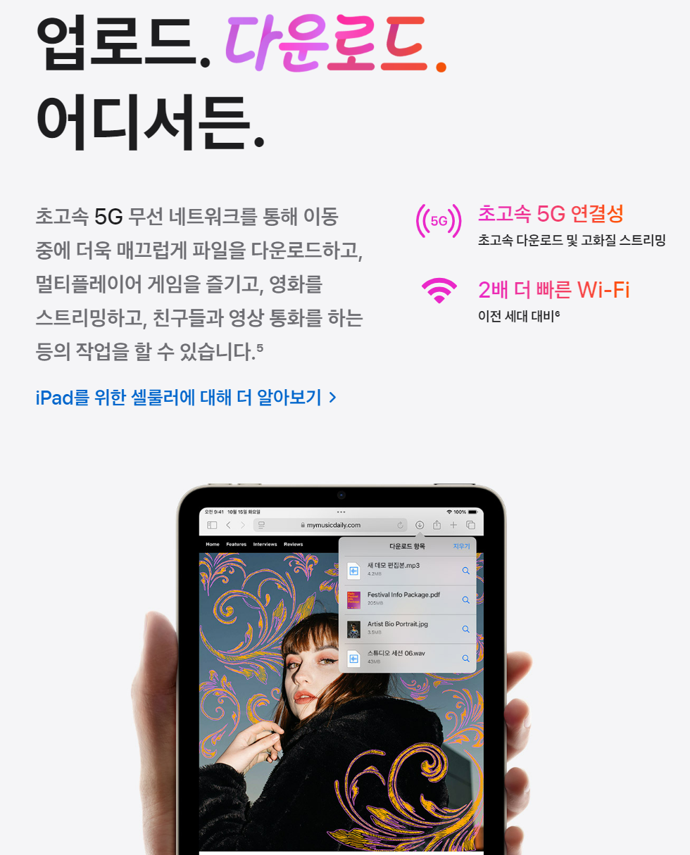 초고속 5G 무선 네트워크를 통해 이동 중에 더욱 매끄럽게 파일을 다운로드하고, 멀티플레이어 게임을 즐기고, 영화를 스트리밍하고, 친구들과 영상통화를 하는 등의 작업을 할 수 있어요.