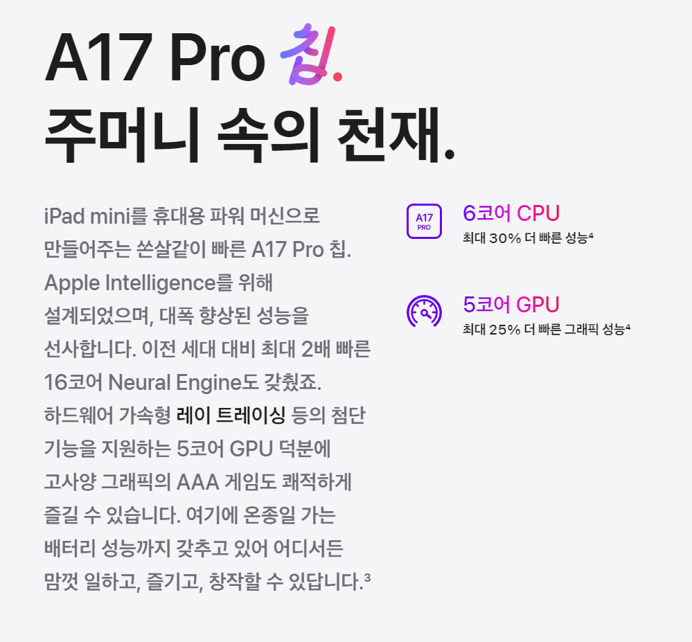 특히 아이패드 미니는 휴대 측면에서도 사이즈가 용이해서 아이패드 미니 모델을 선호하시는 분들도 계시더라구요. 아이패드 미니 7세대라고 부르시는 분들이 많지만 이 시리즈의 정식 명칭은 아이패드 미니 A17 Pro인데요. 이름에서 알 수 있듯이 아이폰 15 Pro에 탑재되어 있는 A17 칩이 탑재되어 있어요.