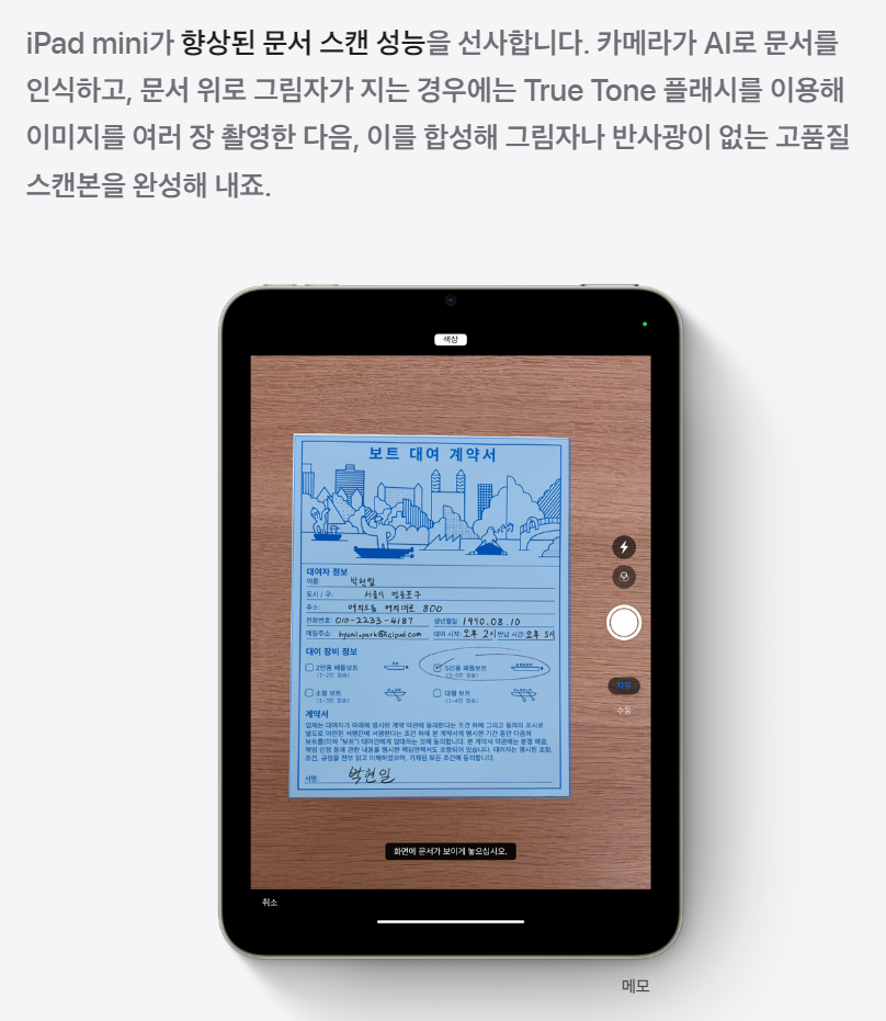 카메라가 AI로 문서를 인식하고, 문서위로 그림자가 지는 경우에는 true tone 플래시를 이용해 이미지를 여러 장 촬영한 다음, 이름 합성해 그림자나 반사광이 없는 고품질 스캔본을 완성해내요.