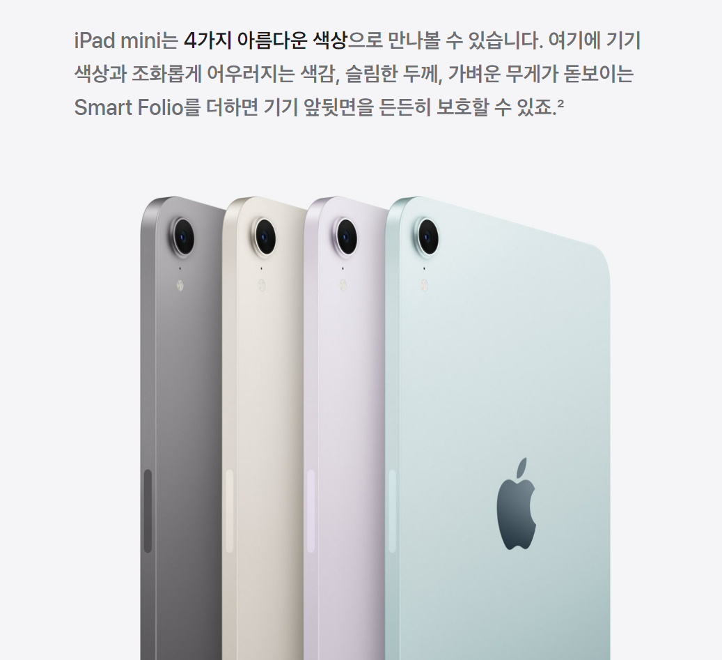 아이패드 미니는 4가지 아름다운 색상으로 만나볼 수 있어요. 기기 색상과 조화롭게 어우러지는 색감, 슬림한 두께, 가벼운 무게가 돋보이는 smart folio까지 더한다면 기기 앞뒷면을 든든하게 보호할 수 있어요.