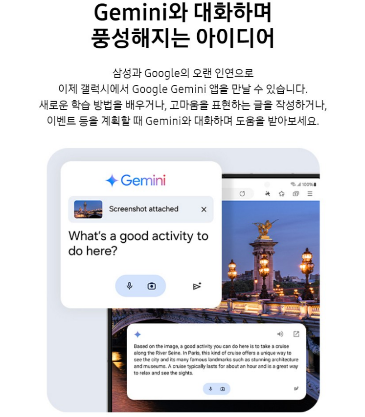 갤럭시에서 Google Gemini 앱을 만날 수 있어요. 새로운 학습 방법을 배우거나, 고마움을 표현하는 글을 작성하거나, 이벤트 등을 계획할 때 Gemini와 대화하며 도움을 받아보세요.