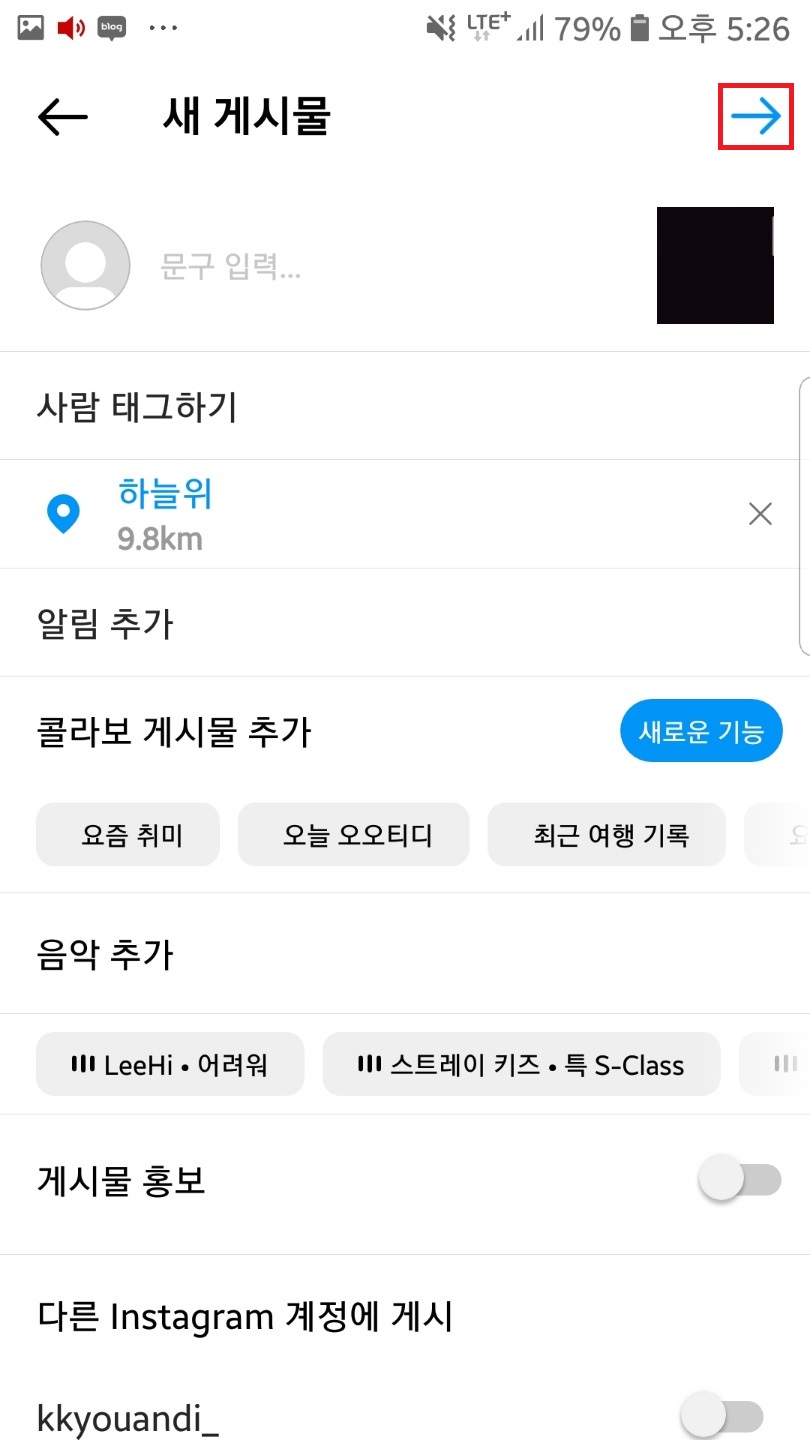상단 화살표를 눌러 게시물을 등록해주시고 등록된 게시물 계정 이름 밑에 장소가 추가됐는지 확인해보세요!