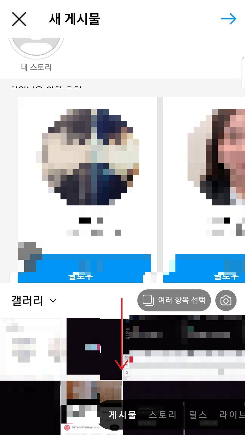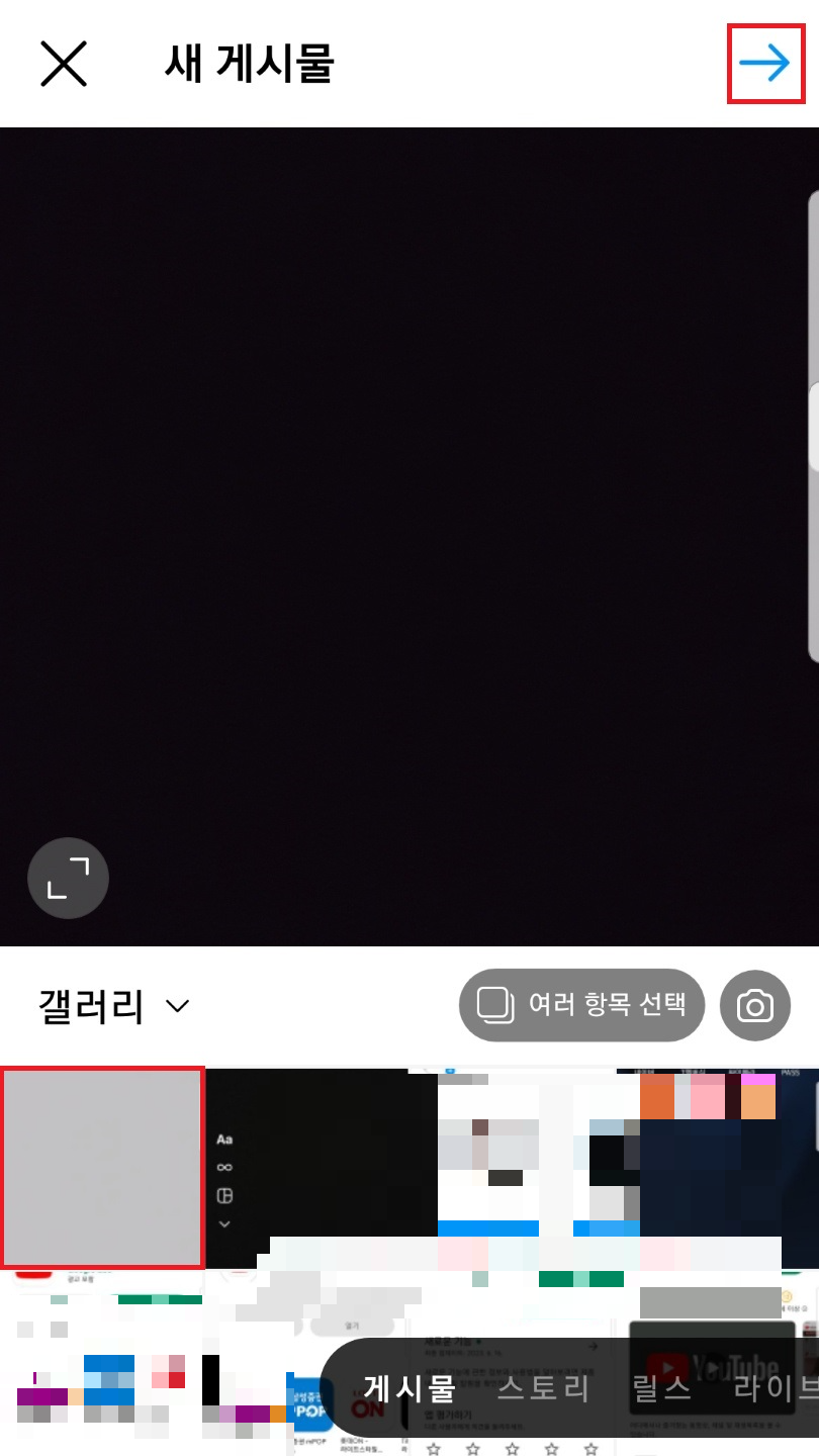 올릴 사진을 선택해주시고 상단 화살표를 눌러 다음으로 두 번 넘어가주세요.
