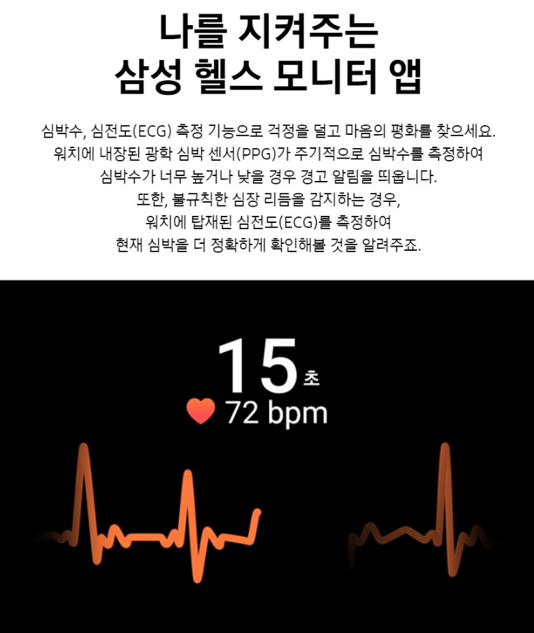 심박수, 심전도 측정 기능으로 걱정을 덜고 마음의 평화를 찾으세요. 워치에 내장된 광학 심박 센서가 주기적으로 심박수를 측정하여 심박수가 너무 높거나 낮을 경우 경고 알림을 띄워줘요. 또한, 불규칙한 심장 리듬을 감지하는 경우, 워치에 탑재된 심전도를 측정하여 현재 심박을 더 정확하게 확인해볼 것을 알려줘요.
