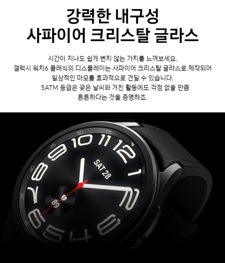 시간이 지나도 쉽게 변치 않는 가치를 느껴보세요. 갤럭시 워치 6 클래식의 디스플레이는 사파이어 크리스탈 글라스로 제작되어 일상적인 마모를 효과적으로 견딜 수 있어요. 5ATM 등급은 궂은 날씨와 거친 활동에도 걱정 없을 만큼 튼튼하다는 것을 증명해줘요.