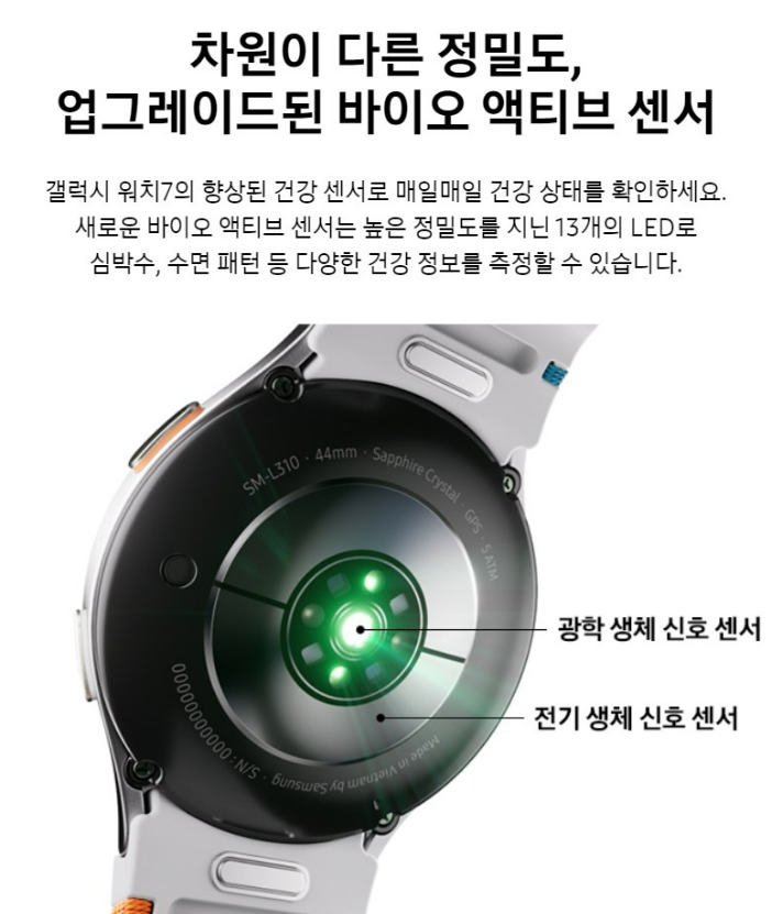 갤럭시워치 7의 향상된 건강 센서로 매일매일 건강 상태를 확인하세요. 새로운 바이오 액티브 센서는 높은 정밀도를 지닌 13개의 LED로 심박수, 수면 패턴 등 다양한 건강 정보를 측정할 수 있어요.