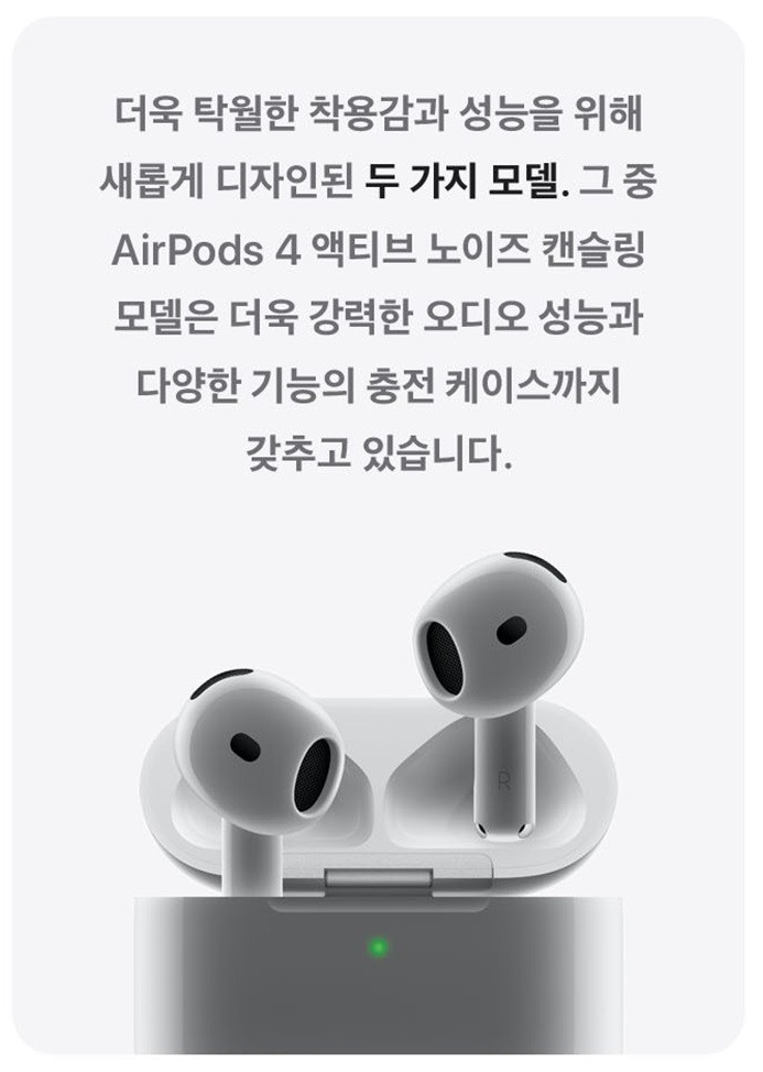 더욱 탁월한 착용감과 성능을 위해 새롭게 디자인 된 에어팟 4는 액티브 노이즈 캔슬링으로 더욱 강력한 오디오 성능과 다양한 기능의 충전 케이스까지 갖추고 있어요.