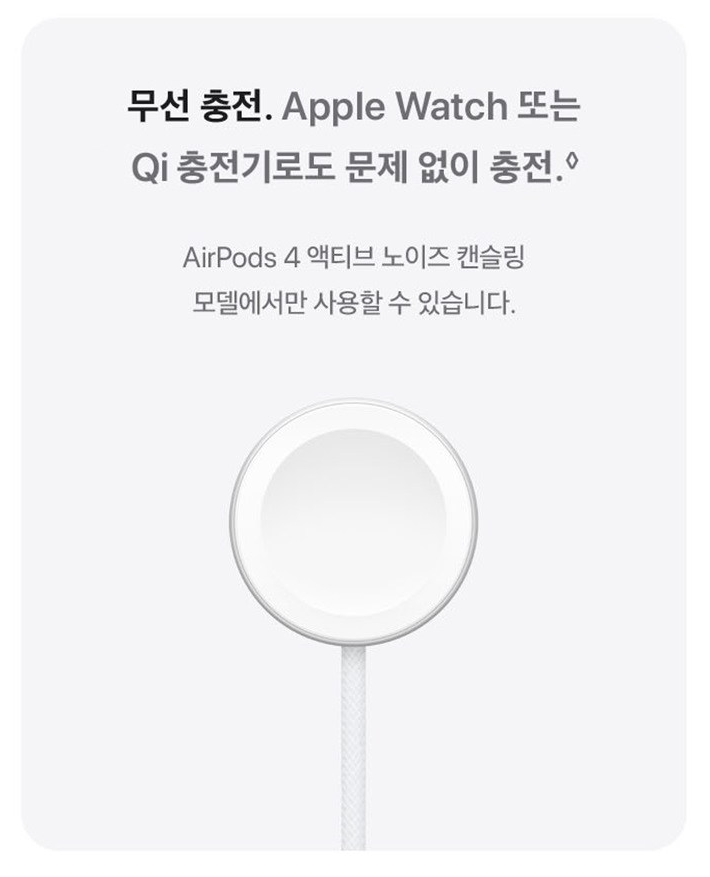 에어팟 4세대 액티브 노이즈 캔슬링 모델은 애플 워치 또는 Qi 인증 충전기를 통해 케이스를 충전할 수 있어요.