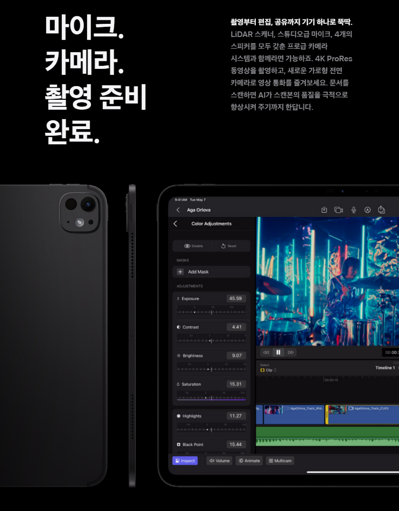 LiDAR 스캐너, 스튜디오급 마이크, 4개의 스피커를 모두 갖춘 프로급 카메라 시스템과 촬영부터 편집, 공유까지 기기 하나로 가능해요. 4K ProRes 동영상을 촬영하고, 새로운 가로형 전면 카메라로 영상 통화를 즐길 수 있어요. 문서를 스캔하면 AI가 스캔본의 품질을 극적으로 향상시켜 주기까지 한답니다.