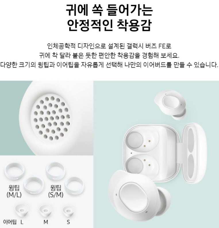 인체공학적 디자인으로 설계된 갤럭시 버즈 FE로 귀에 착 달라 붙은 듯한 편안한 착용감을 경험해 보세요. 다양한 크기의 윙팁과 이어팁을 자유롭게 선택해 나만의 이어버드를 만들 수 있어요.