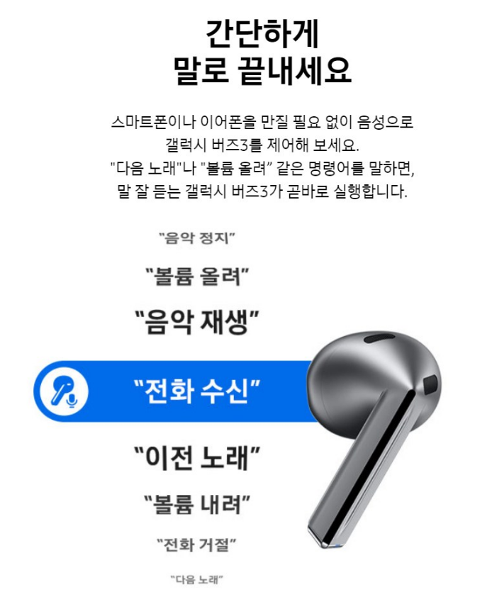 스마트폰이나 이어폰을 만질 필요 없이 음성으로 갤럭시 버즈3을 제어해 보세요. 명령어를 말하면 말 잘 듣는 갤럭시 버즈3이 바로 실행해요.