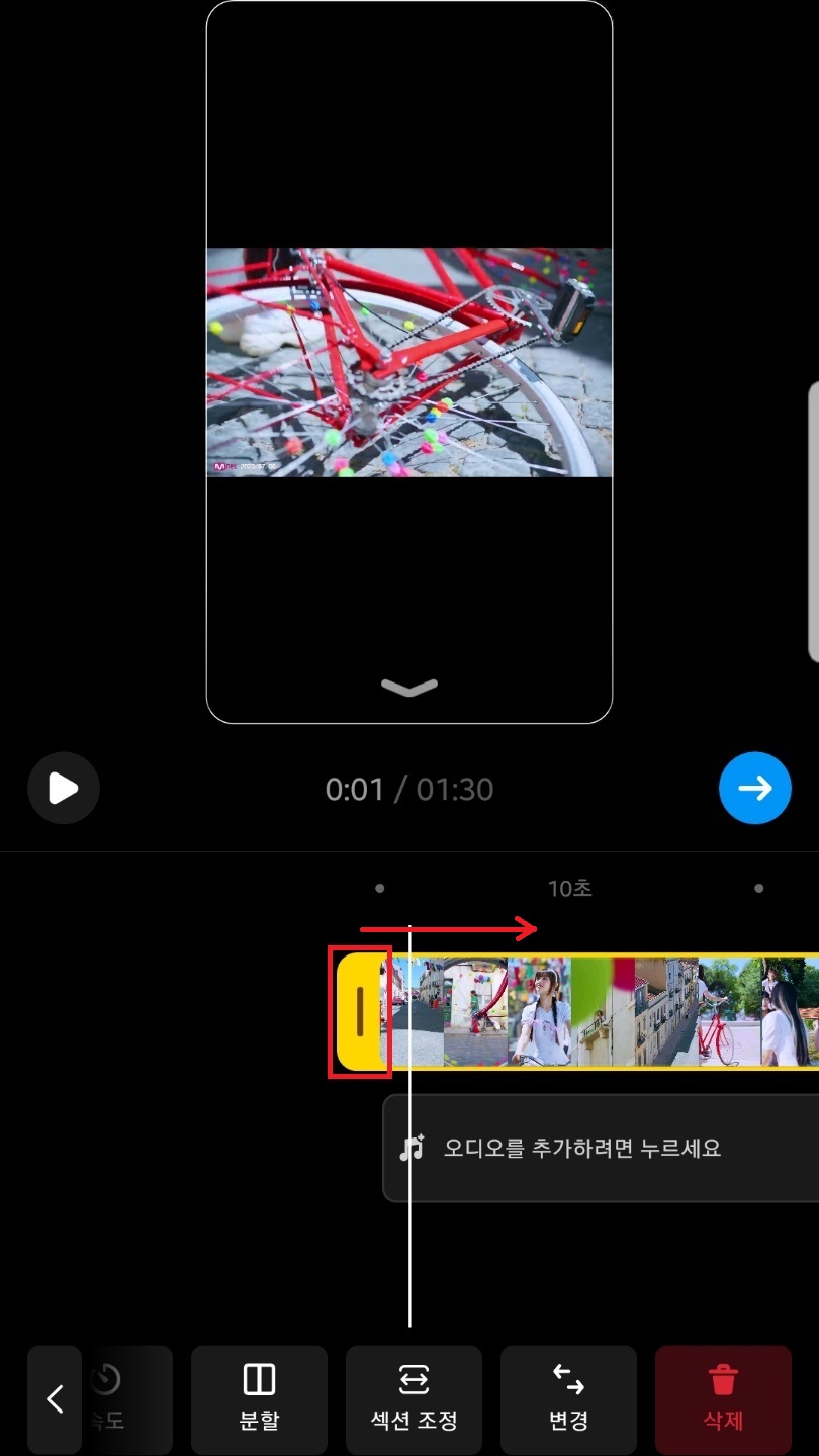 섹션 조정▶동영상 꾹 누른 상태에서 좌우로 이동