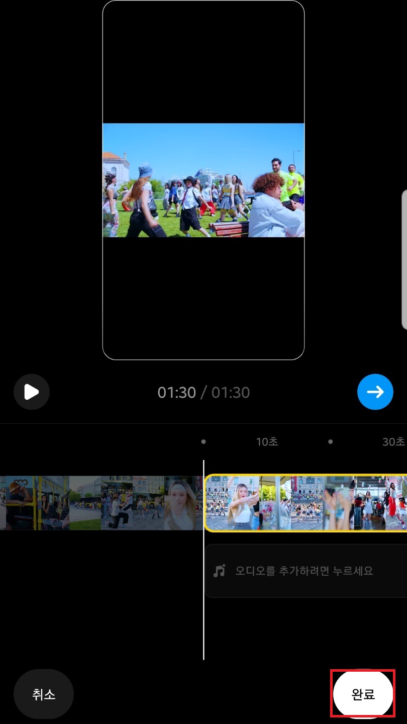 동영상 시작점을 조정하셨다면 하단 완료를 눌러주시고, 오른쪽 화살표를 눌러주신 후 다음버튼을 눌러 동영상을 업로드해주시면 돼요!