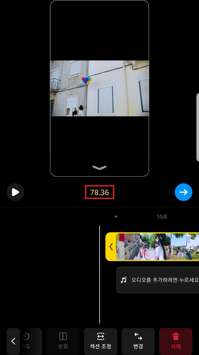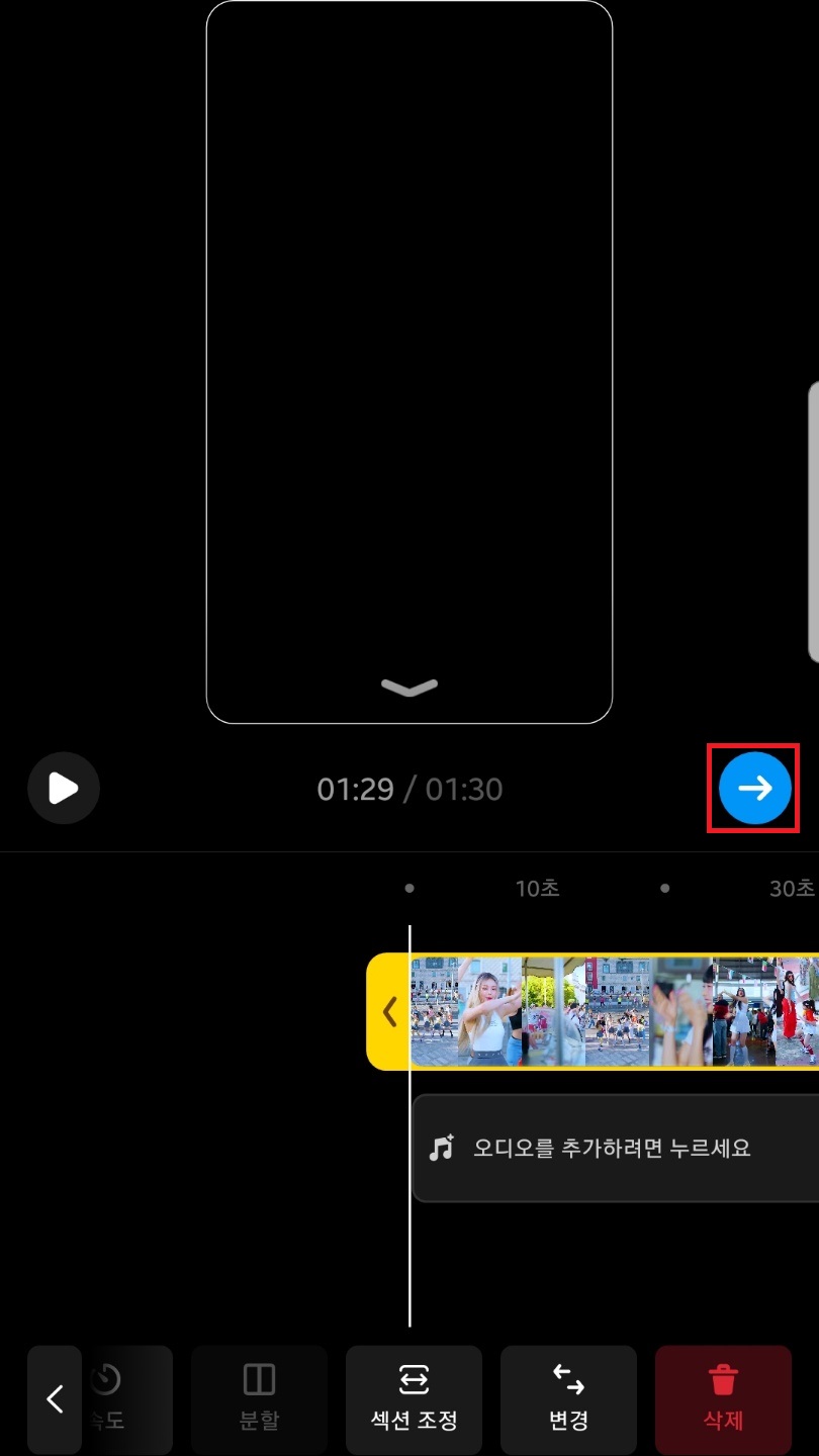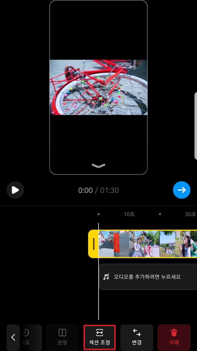 밑에 섹션 조정을 누른 뒤 동영상을 꾹 누른 상태에서 좌우로 이동하여 시작점을 지정해주세요. 동영상 길이는 최대 90초(1분 30초)까지 가능하답니다.