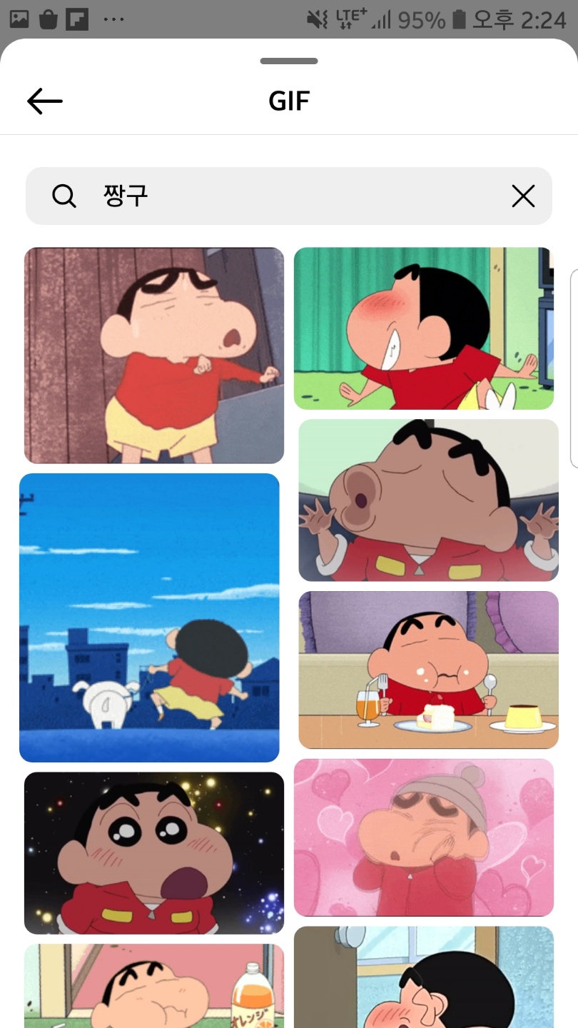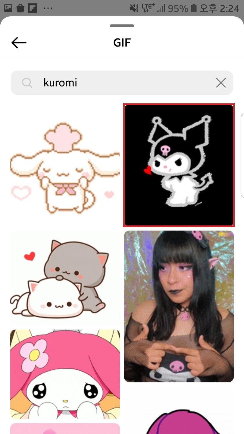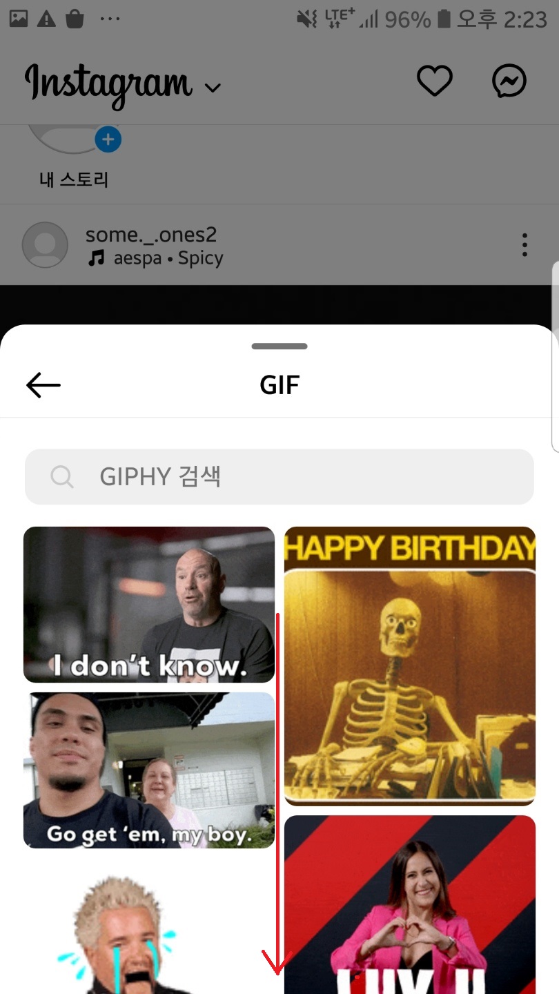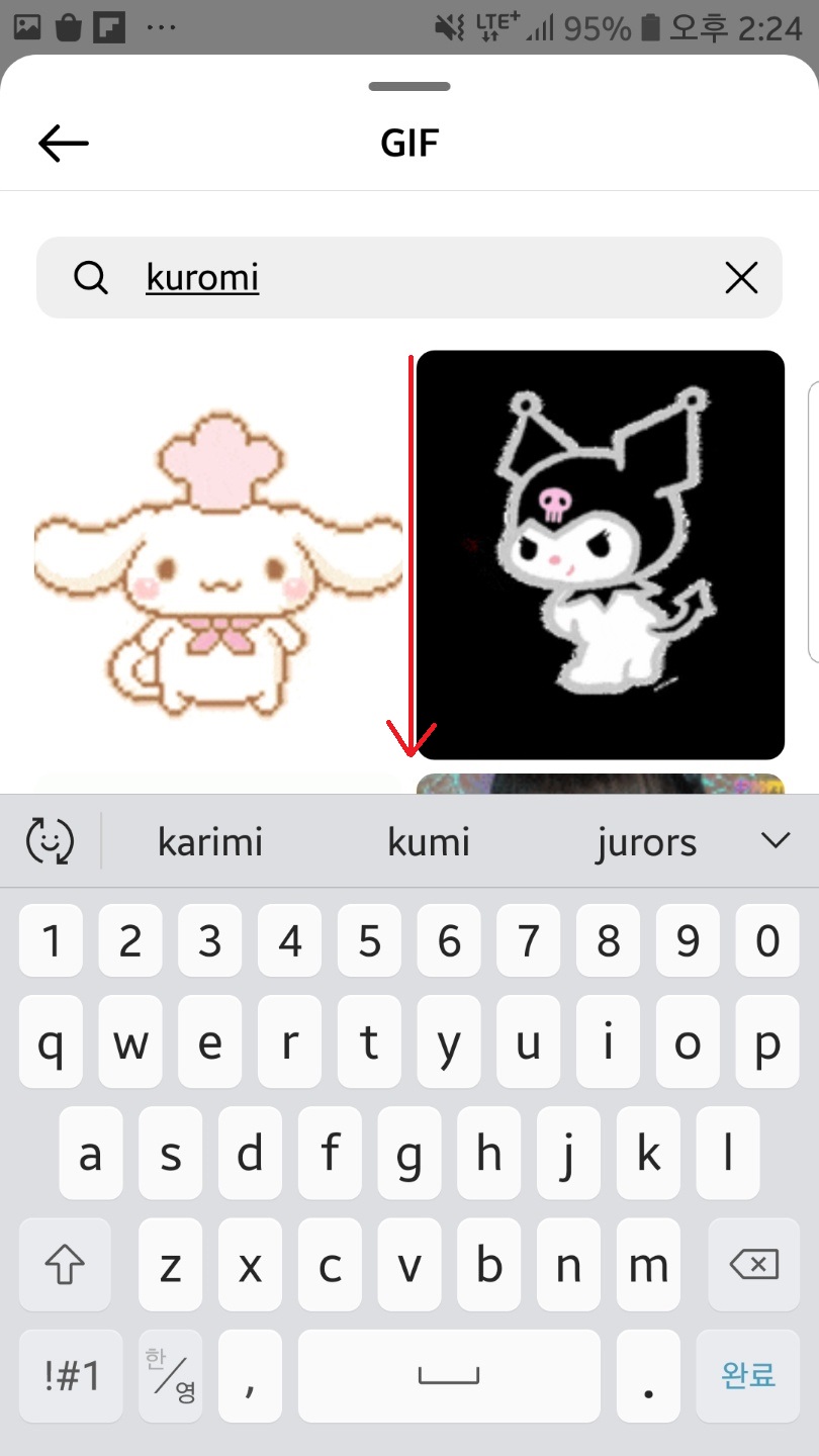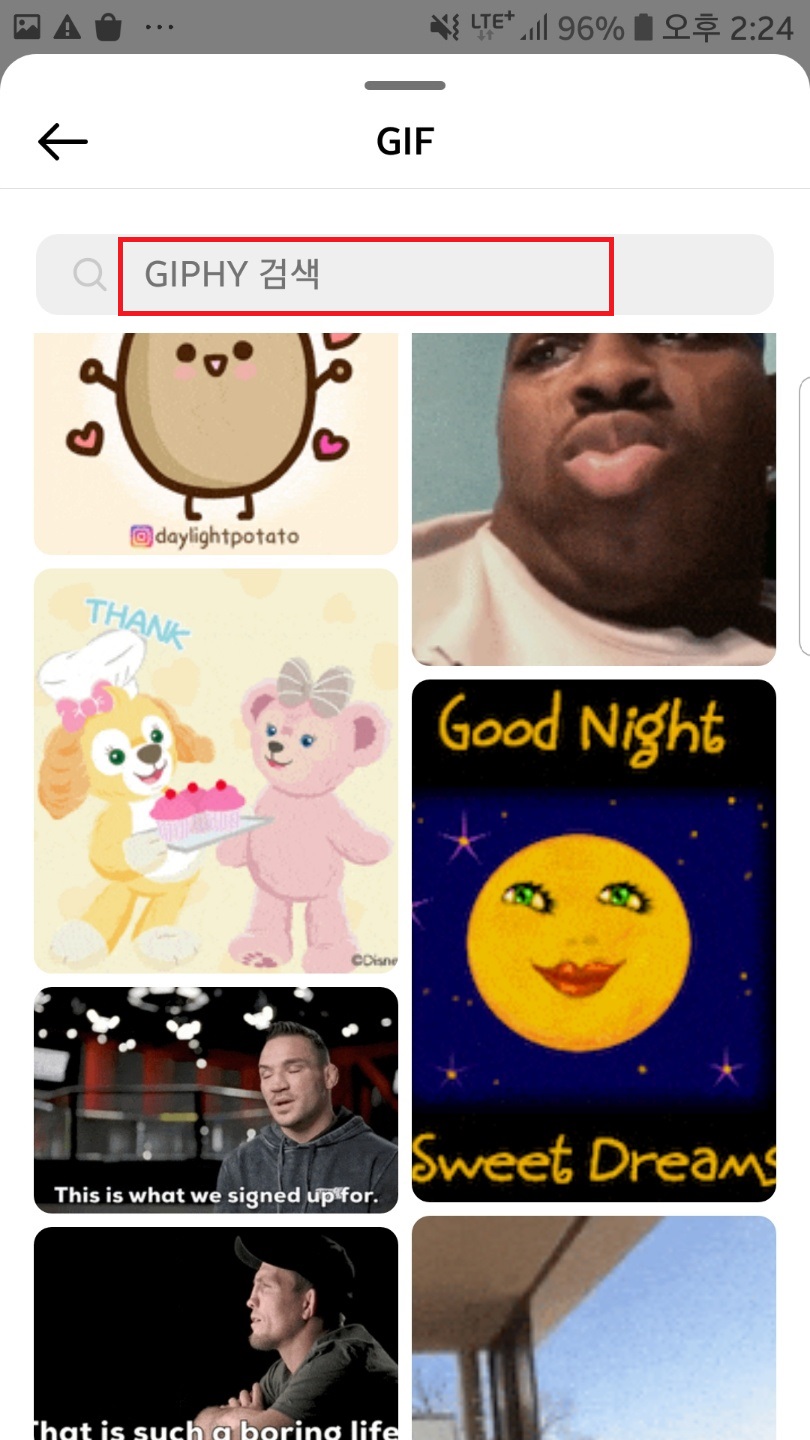 원하는 움짤이 없으면 검색 기능을 사용해주면 되는데요. GIPHY 검색칸을 눌러 키워드를 검색해주시고 아래로 스크롤하여 원하는 움짤을 찾아줘요.