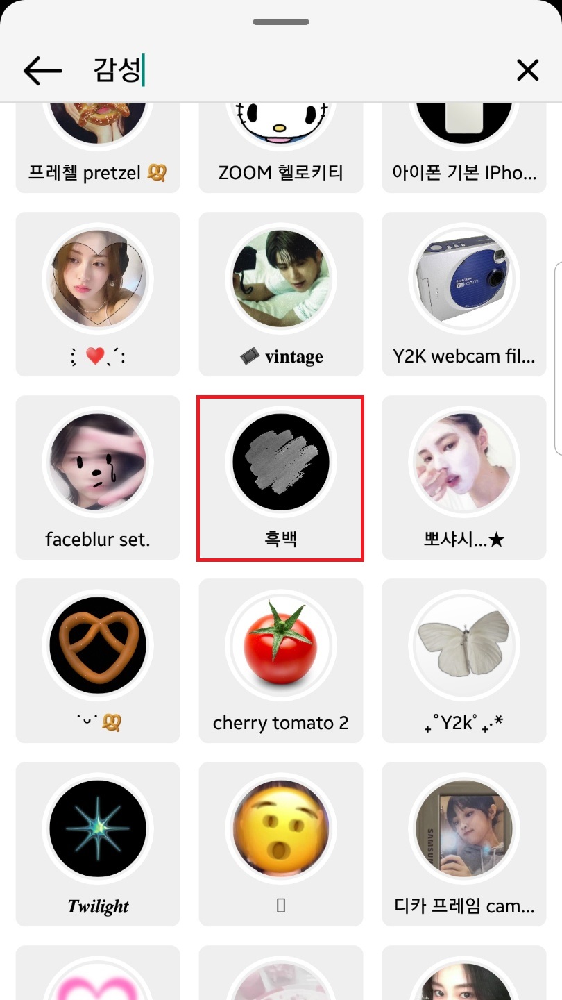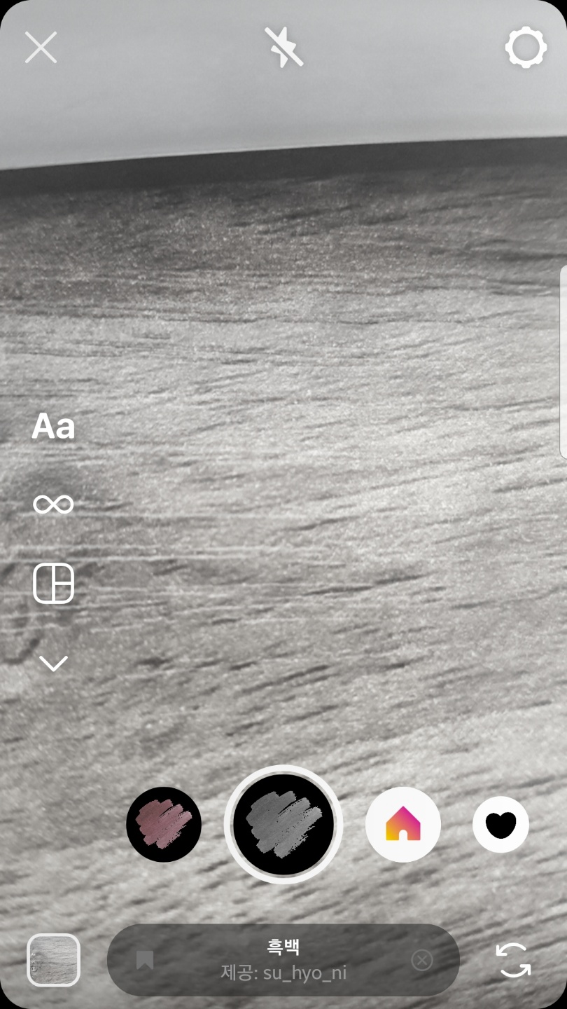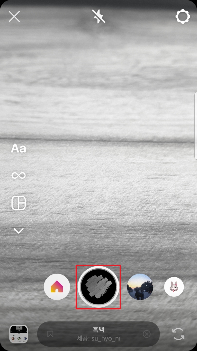 효과를 사용하고 바로 스토리에 올리면 스토리 상단에 어떤 필터를 사용했는지 정보가 뜨니, 이 점 참고하세요!