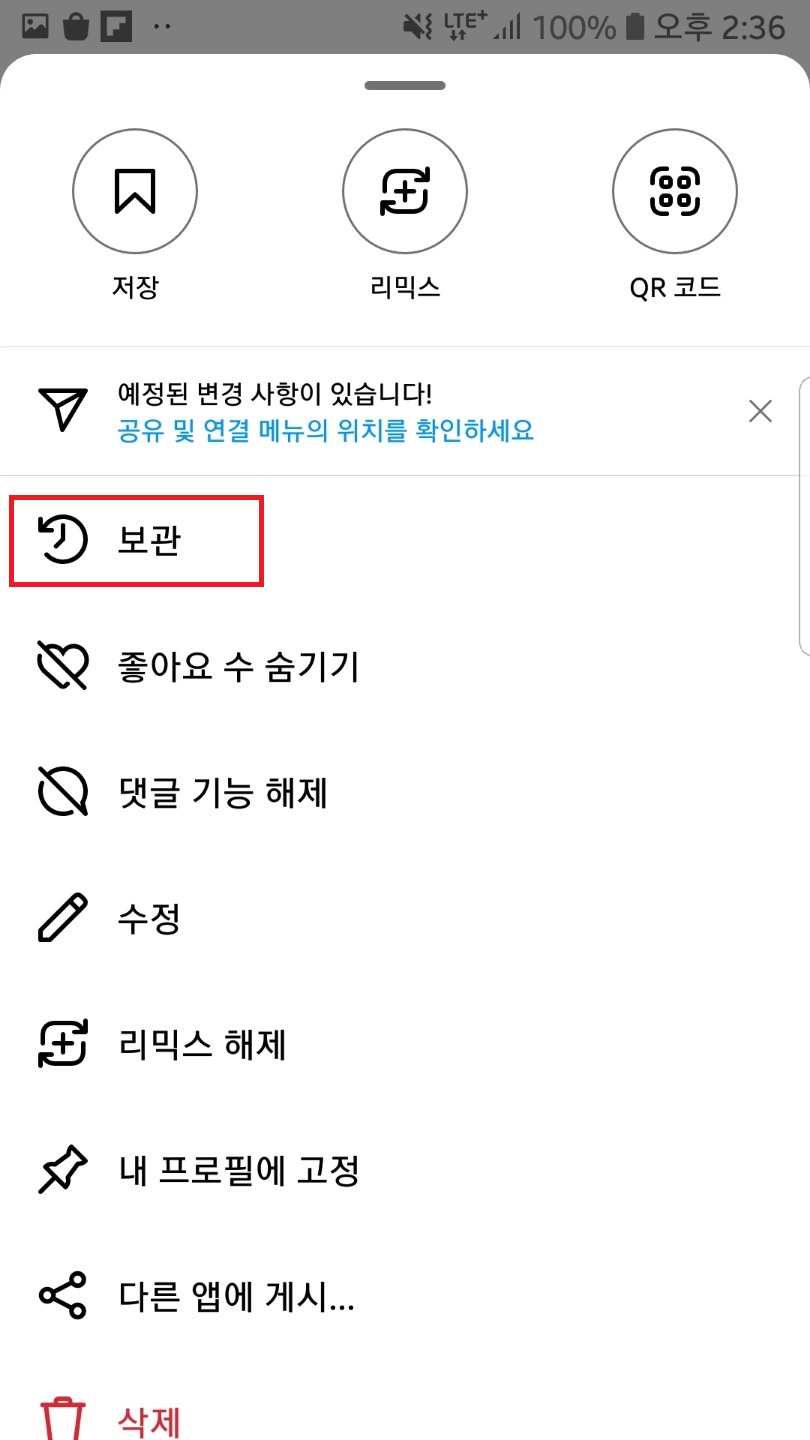 보관된 게시물 선택▶우측 상단 선 세개